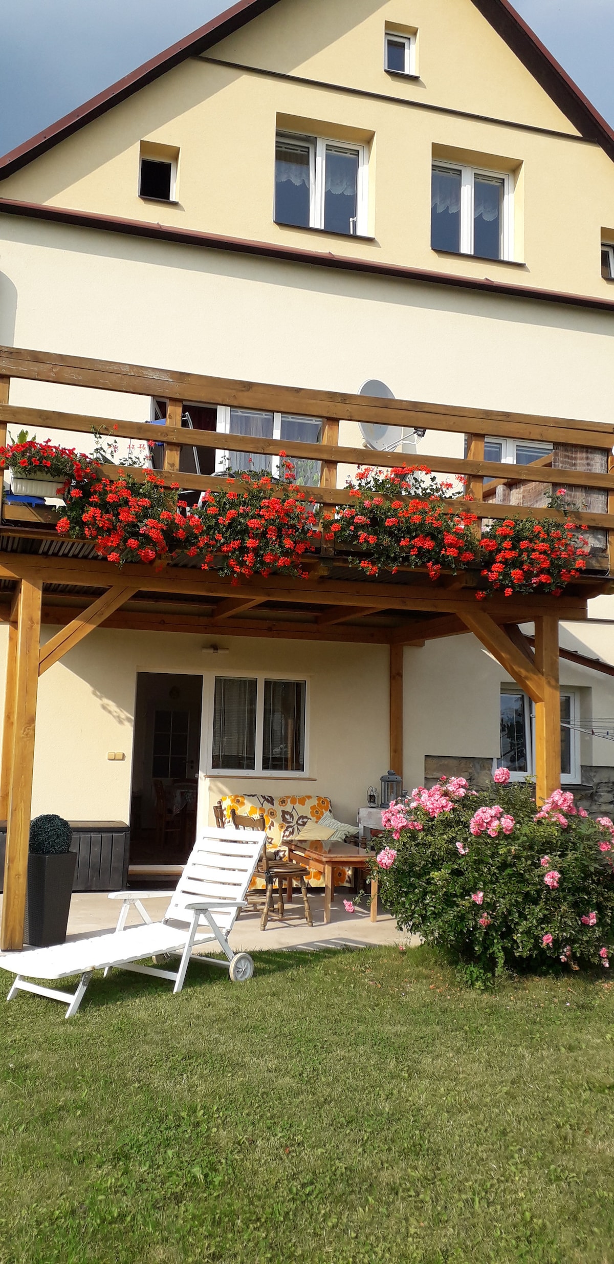 Zažijte dokonalou dovolenou v domě jen pro vás! Na rozlehlém pozemku 5400 m² na vás čeká krásná oplocená zahrada, vybavená zahradním nábytkem, grilem (pouze v letni sezóně) a trampolínou pro Vaše děti. Uvnitř domu najdete 5 pohodlných ložnic, velký obývací pokoj s fotbálkem a plně vybavenou kuchyní. Pro vaši zábavu je v garáži připraven stolní tenis. Užijte si koupání v jezírku přímo u domu, které je pouze pro Vás. V zimě doporučujeme sněhové řetězy. Parkování je možné za plotem či v garáži.