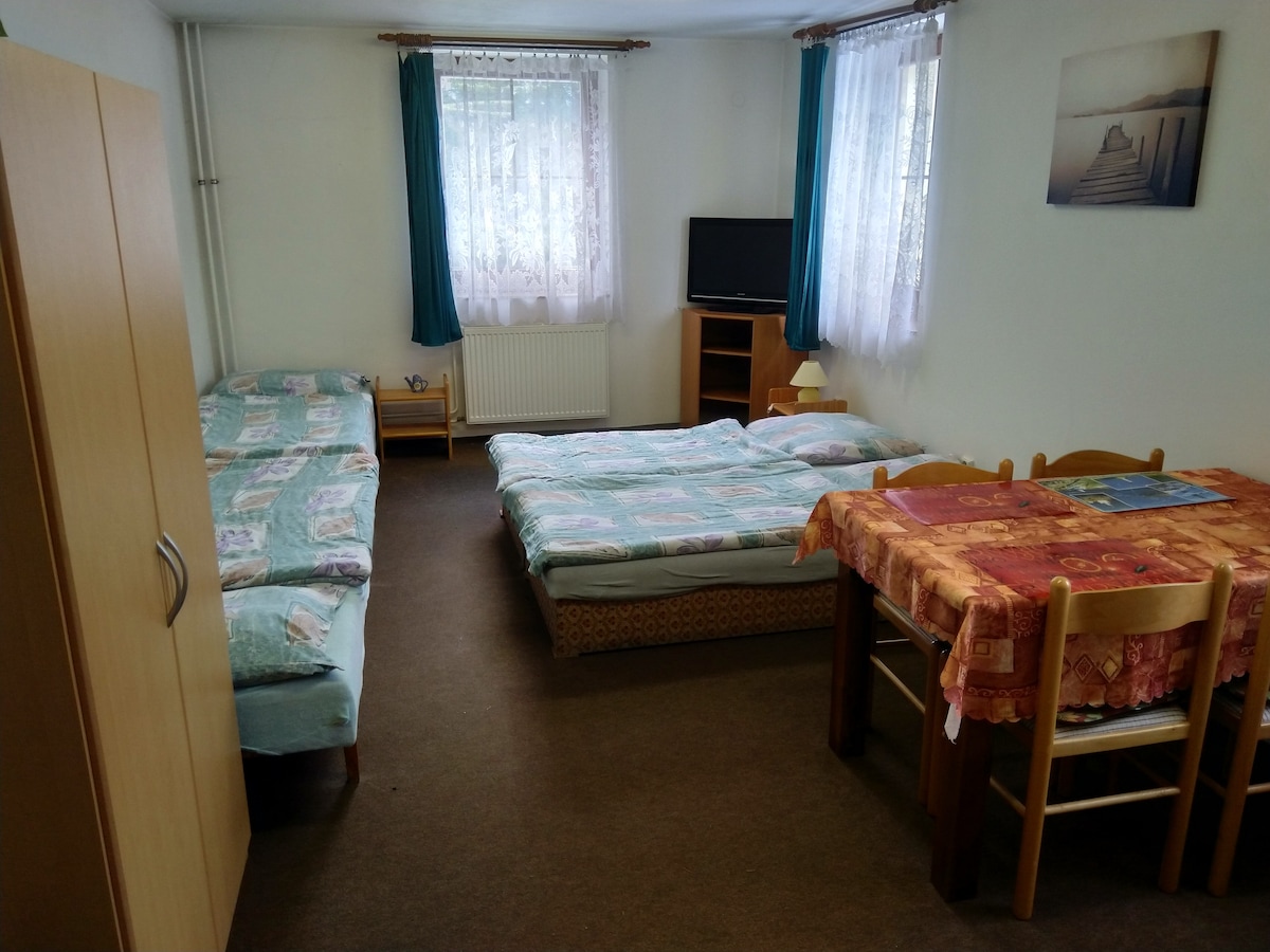 Dům se nachází mezi rodinnými domy v klidném prostředí. Bydlím v něm já, přítel, střídavě syn Mattias a náš pes Arnošt. Domácnosti jsou oddělené, proto budeme moc rádi když využijete možnost samoobslužného ubytování. Byt je kompletně vybaven a zařízen v moderním a vzdušném stylu. Zakládáme si na tom, aby v celém domě vládla pohoda, příjemná atmosféra, pořádek a klid.