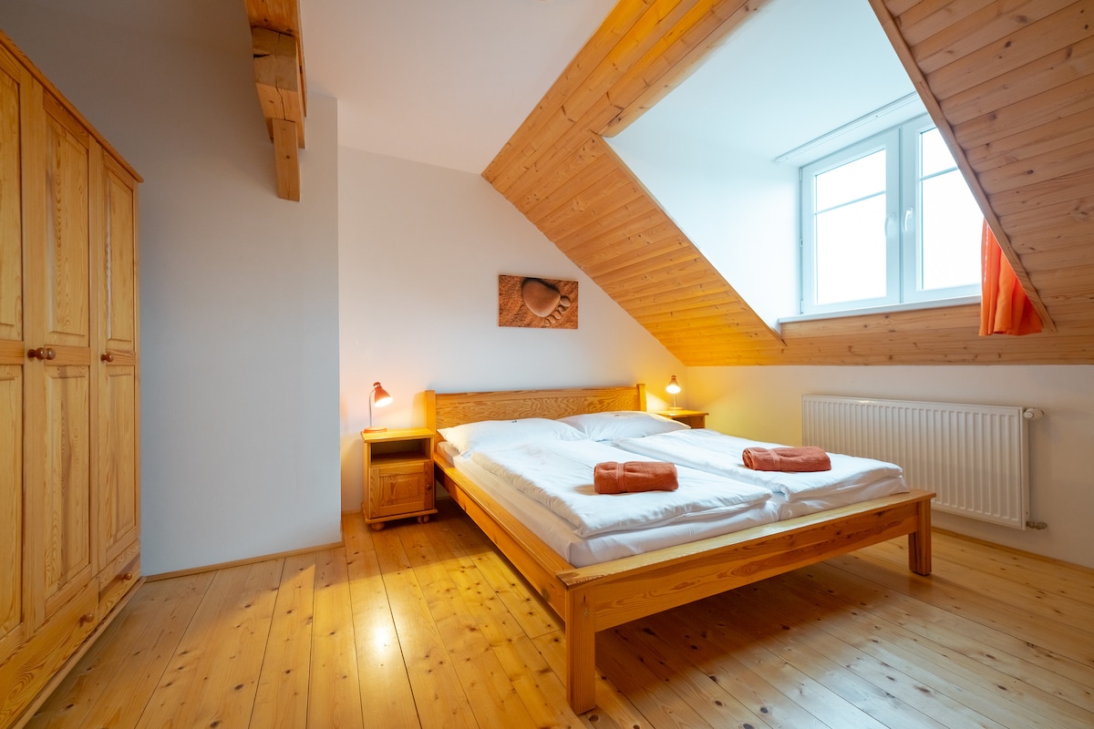 Půvabná starobylá chalupa s vlastní saunou, renovovaná v roce 2023. Obývací prostor zahrnuje pohovku (dvoulůžko), jídelní stůl, krbová kamna, televizi a kuchyňskou linku (keramická varná deska, mikrovlnná trouba, horkovzdušná fritéza, rychlovarná konvice, kávovar na kapsle, myčka). V chodbě lednice s mrazákem. Koupelna se sprchou, samostatné WC. Podkroví: prostorná ložnice, wellness místnost se saunou. Parkování pro 3 auta. Ideální pro rodinný odpočinek.