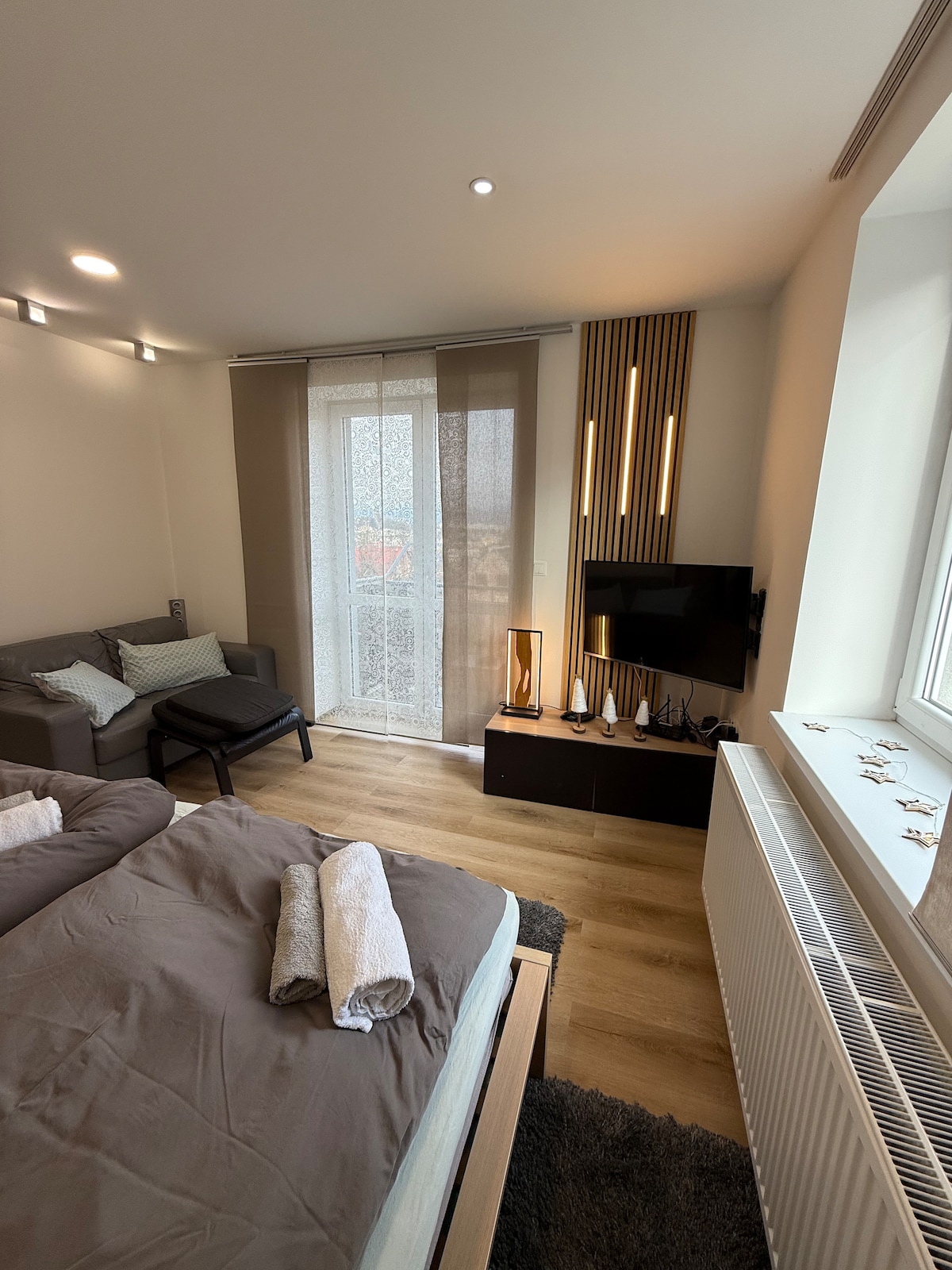 Hezký, útulný a moderní apartmán, velikost typu garsoniera - 1kk - pokoj s pohodlnou manželskou postelí a kuchyňským koutem s balkonem a krásným výhledem na celé město. Z vybavení zde najdete naprosto vše co byste mohli během svého pobytu potřebovat, včetně veškerých hygienických potřeb a mycích přípravků, kávovar Nespresso Vertuo i pár kapslí. V prosinci 2025 byl byt revizalizován, zmodernizován a vymalován, máme novou vinylovou podlahu, novou tichou lednici, designový panel za tv s osvětlením.