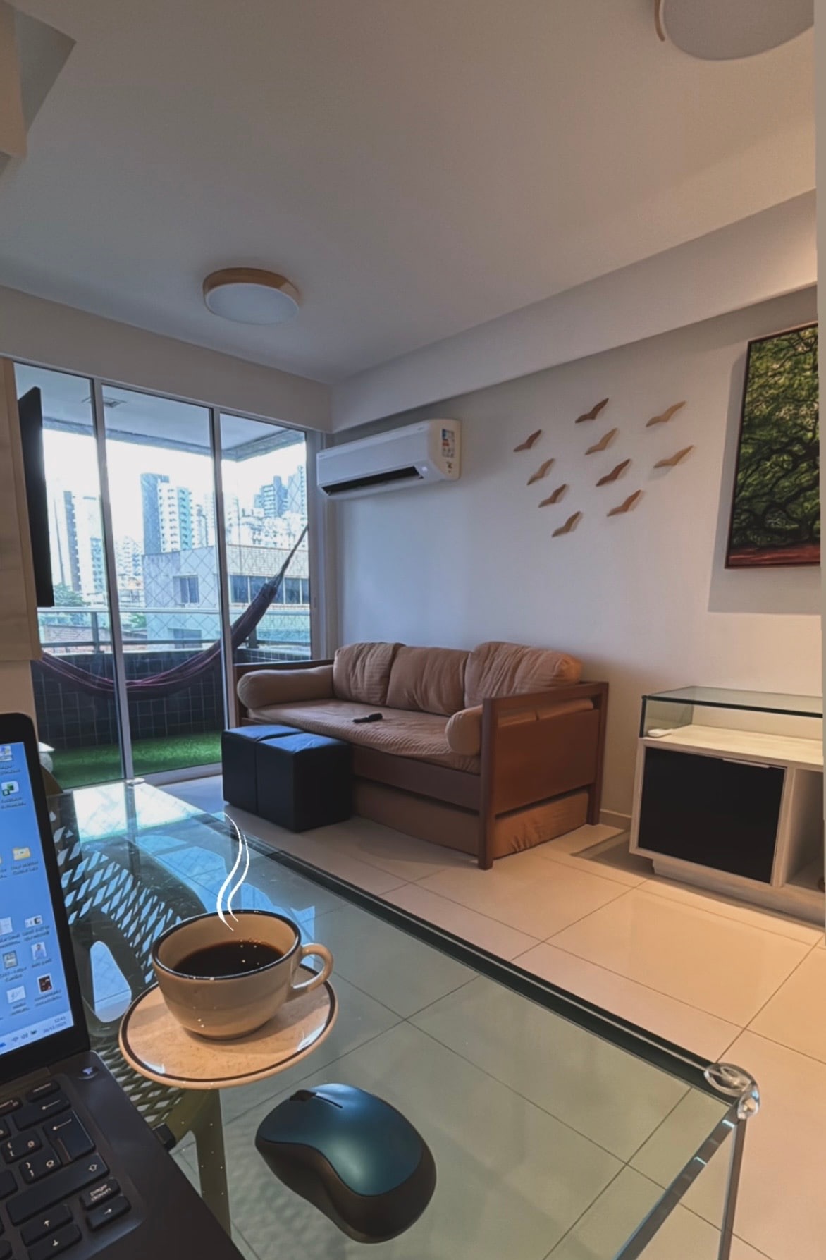 Flat Moderno no Edifício Parque do Cais - Recife Flat na Av. Eng. José Estelita, São José: sala climatizada c/ smart TV e sofá-cama, cozinha americana completa, suíte, internet e eletrodomésticos novos. Vista do Recife antigo e moderno, garagem grátis, perto de pontos turísticos, shopping e praia. Inclui lavanderia, sauna, academia, piscina, coworking e mercado na recepção 24 h. Preço justo. Entre em contato conosco!