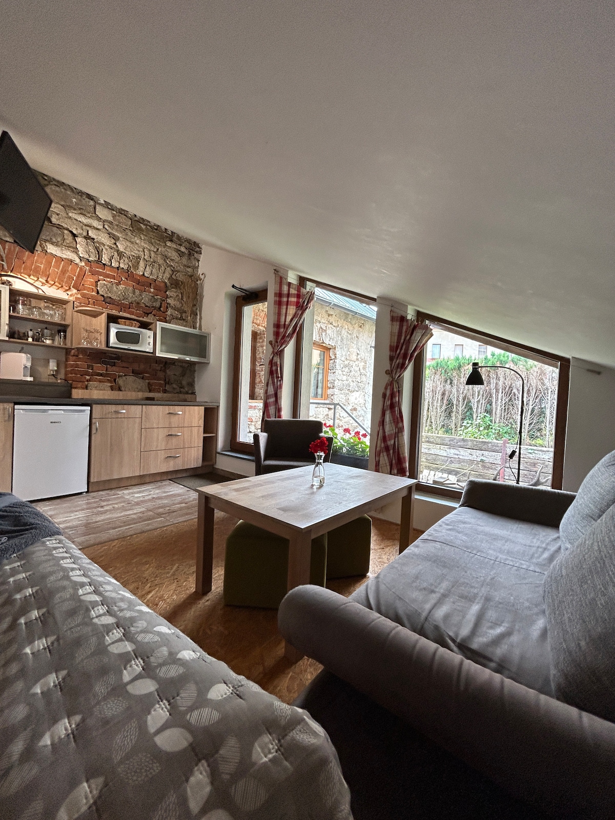 Nový a bezbariérový apartmán se dvěma místnostmi se nachází v docházkové vzdálenosti ke sjezdovce Plešivec/dětskému skiparku, bobové dráze a trailparku. Běžařské stopy začínají hned vedle domu. Součástí bytu je malebná terasa s výhledem na hory a venkovním posezením. Byt disponuje nadstandardně velkou uzamykatelnou lyžárnou/kolárnou, která pojme až 4 kola a která je vybavená též sušákem lyžáků.