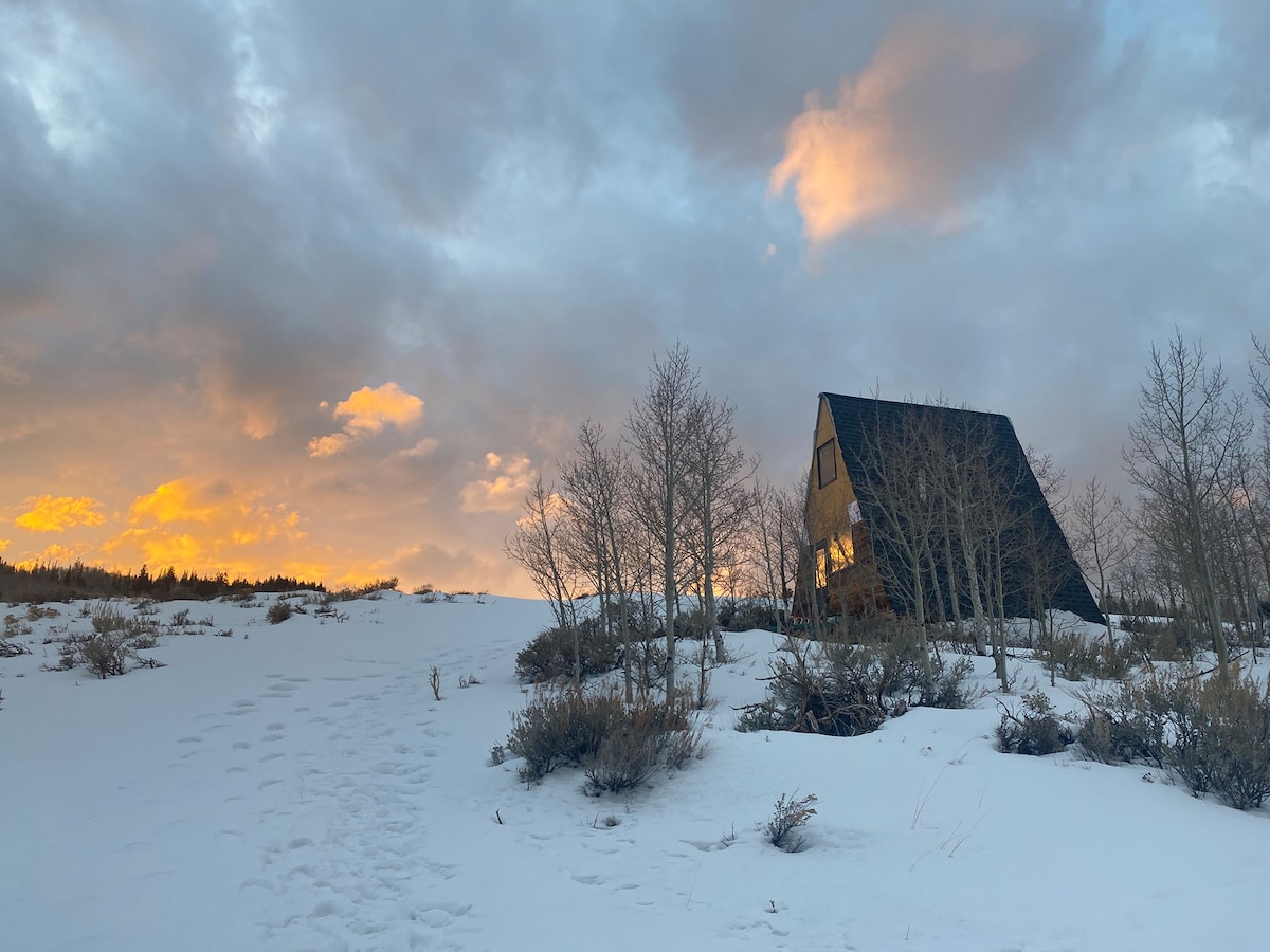 Yampa Blue Tiny Home is a cozy, modern 1 bedroom, 1 bath with high vaulted ceilings, natural light & a back patio looking out to the mountainside. This modern tiny home is perfect for a single or couple. It has a queen bed & dining area table. It is in close proximity to a community BBQ, yard games & campfire in the summer. This cabin has a small kitchenette for simple cooking. Feel free to bring your cooler, camp stove and a bag of ice. Kick back and keep it simple.