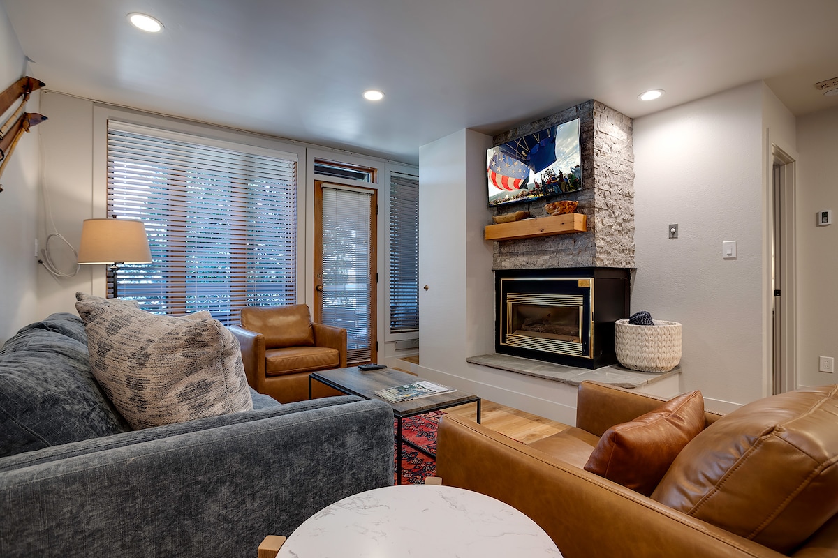 Enjoy a ski in ski out resort type experience at Torian Plum steps from the new Wild Blue gondola with mountain views. This 4th floor condo offers skiing, hiking and swimming right outside your door. One bedroom with queen bed plus pull out sofa bed. New stone fireplace and bathroom plus a fully equipped kitchen with granite counter tops. Private patio. Shared outdoor fire pit/adirondack chairs, heated swimming pool, jacuzzis, and gym. Free shuttle bus for shopping/downtown. In unit laundry.