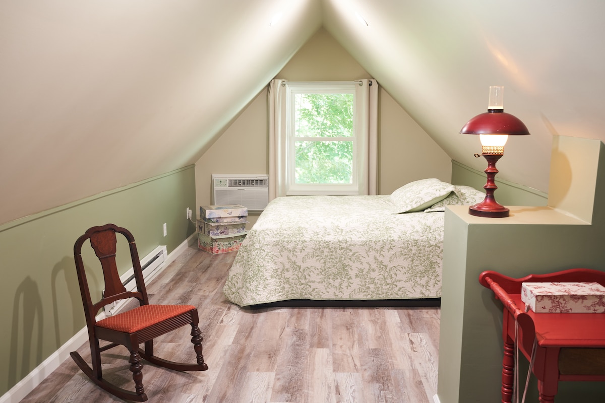 Perched at the top of the house and overlooking the surrounding woods, the Attic Haven is a cozy, tucked-away private attic designed for guests who appreciate quiet, privacy, unique charm, and a beautiful view. This attic room offers a unique stay within our boutique Bed & Breakfast just outside Carbondale, a mile west of SIU. With treetop views, peaceful surroundings, and a warm, inviting feel, it’s an ideal choice for guests who want something a little different from a standard hotel room.