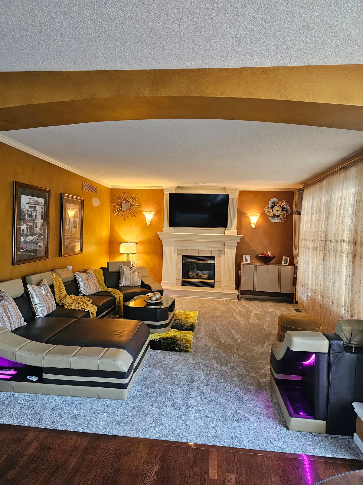 •Spacious 3,400 sq ft home in an extremely safe, peaceful neighborhood •5 bedrooms (4 upstairs, 1 in the basement) with new carpet •Newly renovated bathrooms and updated flooring •Fully equipped kitchen with cookware and utensils •1000 Mbps Wi-Fi •Garage parking for 3 cars •Washer & dryer •Two 85” TVs + one 65” Smart TV •Central air conditioning •Treadmill and stationary bike •All bed linens and fresh towels provided •12 minutes to Arrowhead Stadium •20 minutes to downtown Kansas City