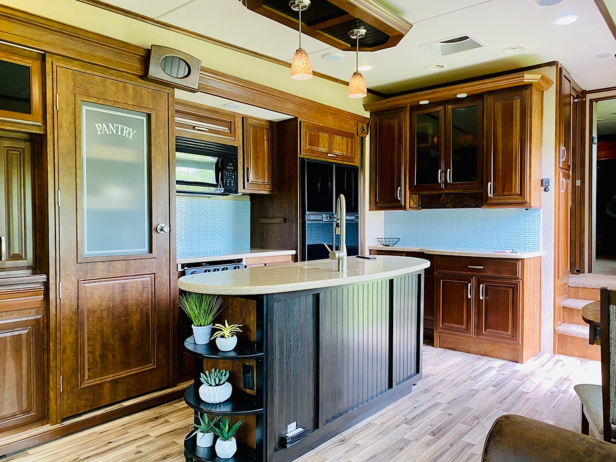 This PREMIUM site and RV is just 10 minutes from Geha Stadium! When not attending the FIFA World Cup you and your guests can enjoy the outdoors and all of the amenities of Blue Springs Lake without having to “rough it”. Our 39 foot luxury Grand Design Solitude is spacious with a full Chef’s Kitchen, a separate master bedroom with washer and dryer as well as 2 additional hideaway beds allow up to 5 people to sleep comfortably.