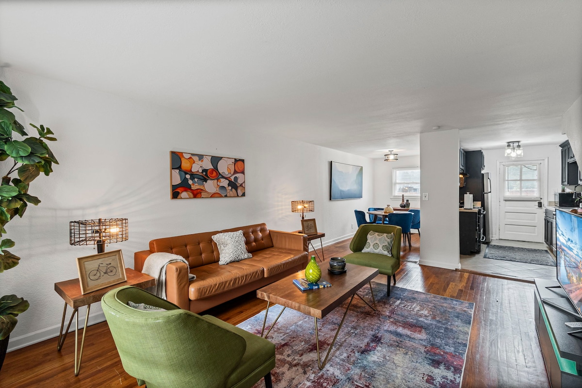 605 Zumwalt is a modern-vibe home located in a quaint neighborhood minutes from IHOPKC. It is also conveniently located a short distance from KCMO’s beautiful downtown where you’ll find the Kauffman Center and multiple event venues. It comes fully outfitted for all of your needs and includes 2 bedrooms each furnished with a Queen Size bed and 1 bathroom with a shower and tub for relaxing after a long day. The home Sleeps 4 comfortably and is ready for guests to enjoy