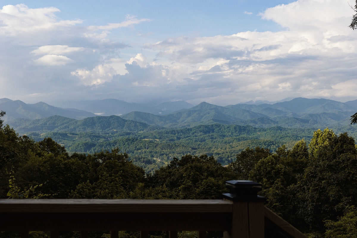 Beautiful scenic amazing views through the Great Smokey Mountains National Park Blue Ridge Parkway. Breath taking panoramic views off-the-grid overlooking farms and countryside Blue Ridge Mtns of NC and TN. Access to Harrah's Cherokee Casino, minutes from Cataloochee Ski Resort, numerous hikes throughout the Smoky Mtns National Park, recreational activities, getaway, Newly built LUXE House Cabin design. Hot Tub View overlooks a pond with water fall. Creative spaces for SMOKEY, SMOKY MOUNTAINS.