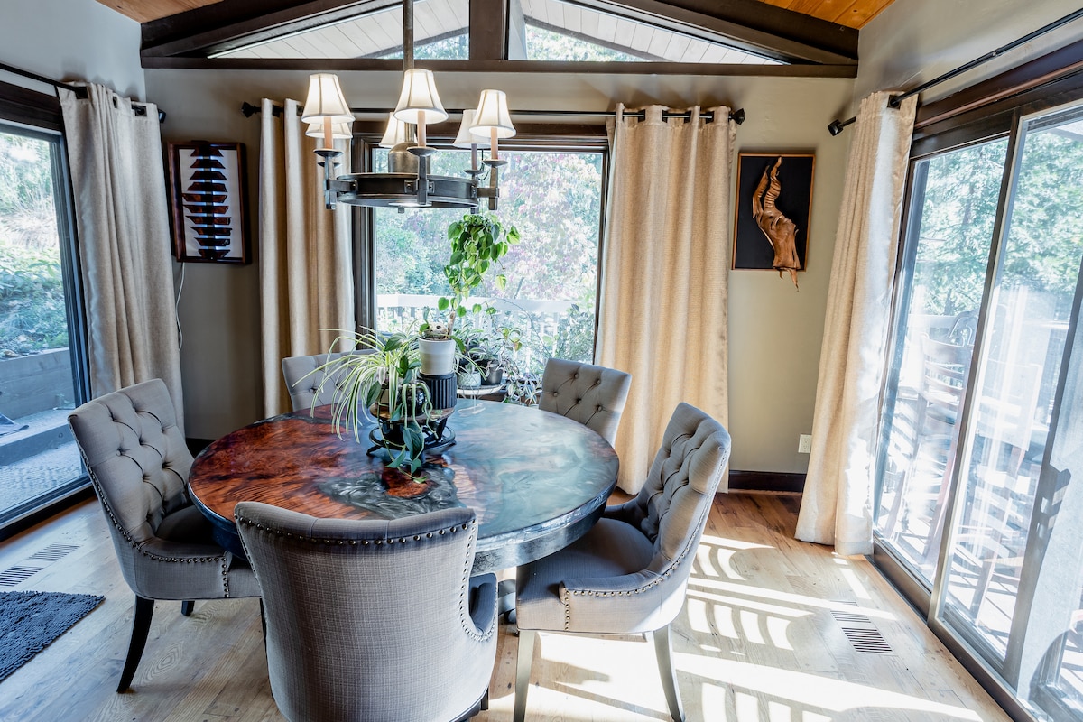 Just steps from Ashland's vibrant restaurant and theater district. Quiet comfort amid a charming post-Victorian atmosphere. Elegant rooms, each with its own private bath and shower. Complimentary wine upon arrival. Coffee/tea available 24 hrs on our Hospitality Landing, just outside your room. Self-serve continental breakfast in dining room of on our beautiful shaded deck, 7 days a week.