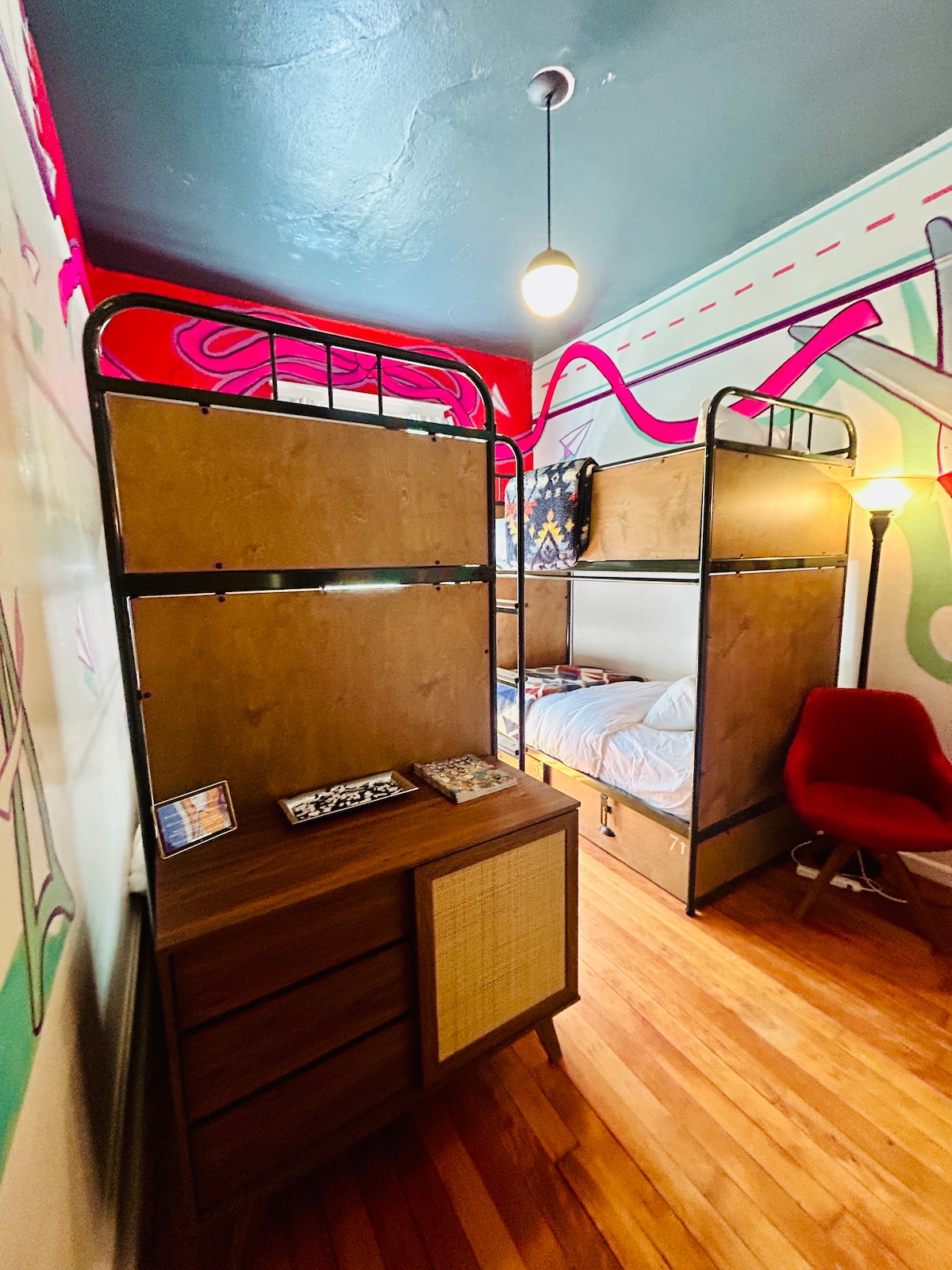 The Premium King with Private Bathroom is an artful, relaxing, sustainable retreat in downtown Ashland. This room is creatively designed with original fixtures, up-cycled furnishings and features a wall art mural by local artist. Over 250 sq/ft with a spacious en-suite featuring a luxurious original clawfoot tub and shower.