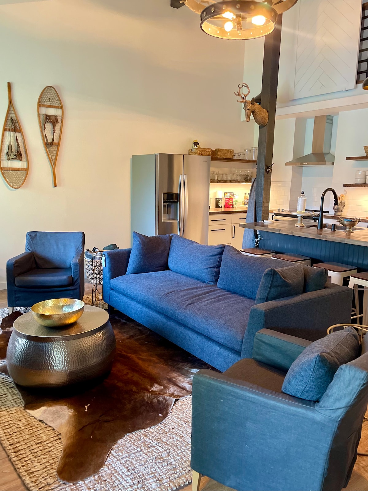 "First Tram" is your powder HQ in the Village. It has all the essential ingredients to a great powder pad: quick access to the tram and Moose Creek lift, comfortable new beds, hot tub passes, a warm cosy den to recover in, boot warmers, ski locker, fast internet a splash of whiskey. We got a bit creative with custom iron work and concrete finishes to trick out out this flat with a touch of authentic Wyoming flare. We hope to compliment your next powder day with a killer place to apres'.