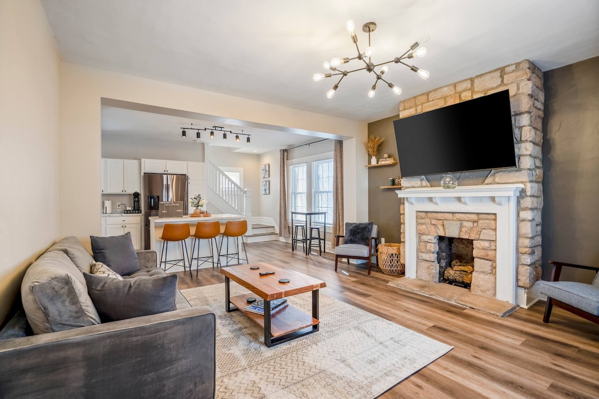 The Bexley Abode is in a prime spot: mins from attractions & highways but tucked in a quaint part of Cbus. It is home-y and conducive to a family or solo visitor. My husband & I remodeled and designed it with thought and sentiment. Highlights: ranch, open layout, cozy couch w/ 50" TV that swivels towards kitchen, gas fireplace, natural light, simple modern design finishes, new appliances, Keurig, hotel- style master bath w/ heated floor, kids room w/ toys/games, USB ports, WiFi, private parking