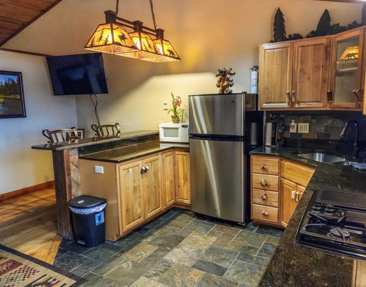 Our 1 Bedroom Condo sleeps up to 4 people, with a Queen bed in the bedroom and full-size sofa sleeper in the living area. Each condo has custom design features. From etched glass artwork signed by the artist to hickory floors, most condos include a gas fireplace as well as heated floors and a full kitchen with granite countertops and more. Every condo at the Mountain Inn is truly a unique masterpiece.
