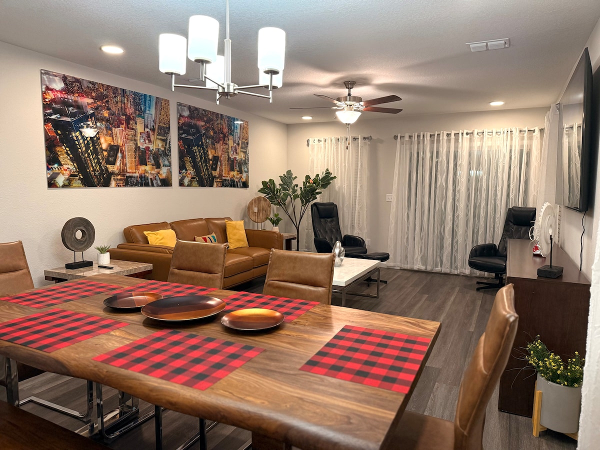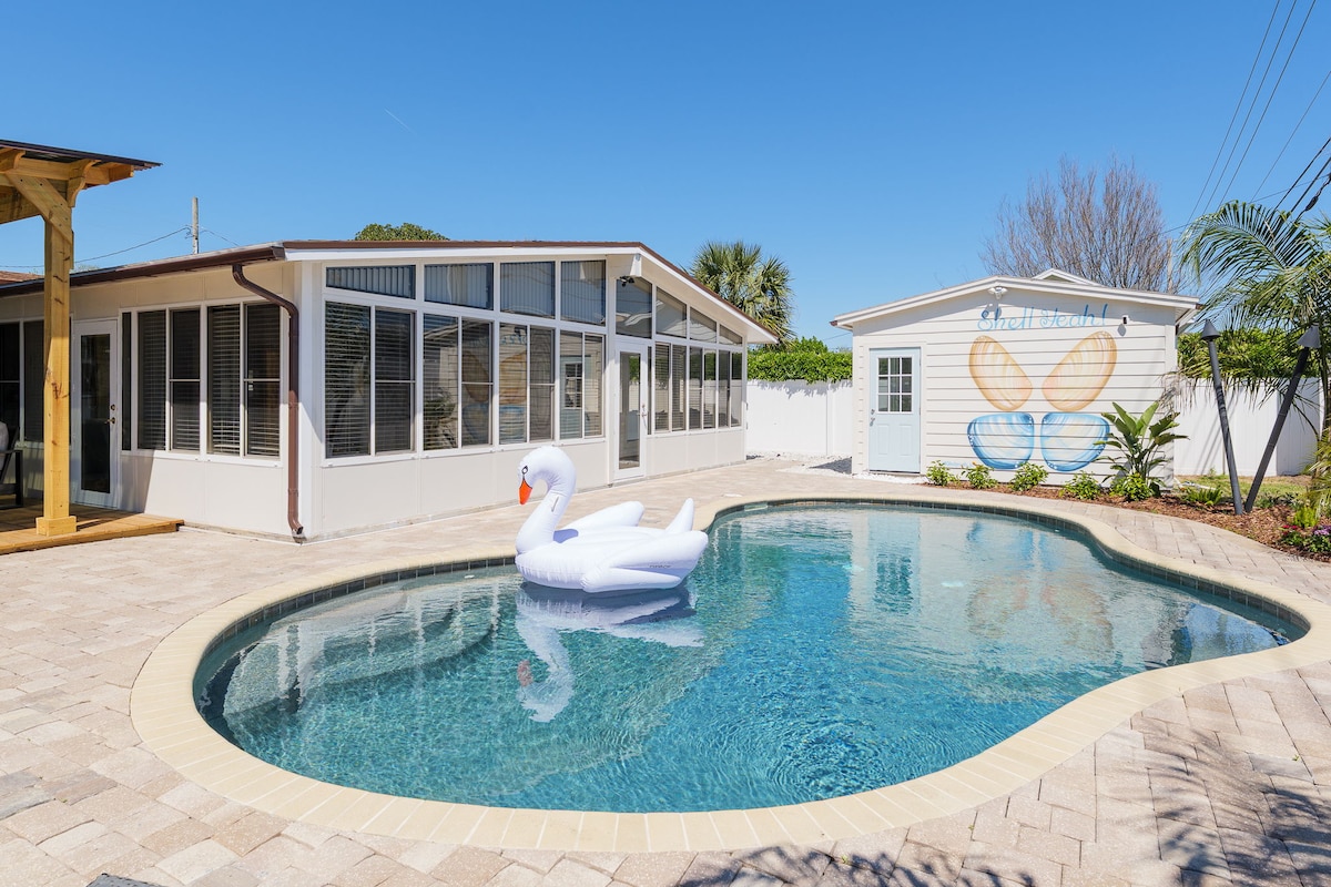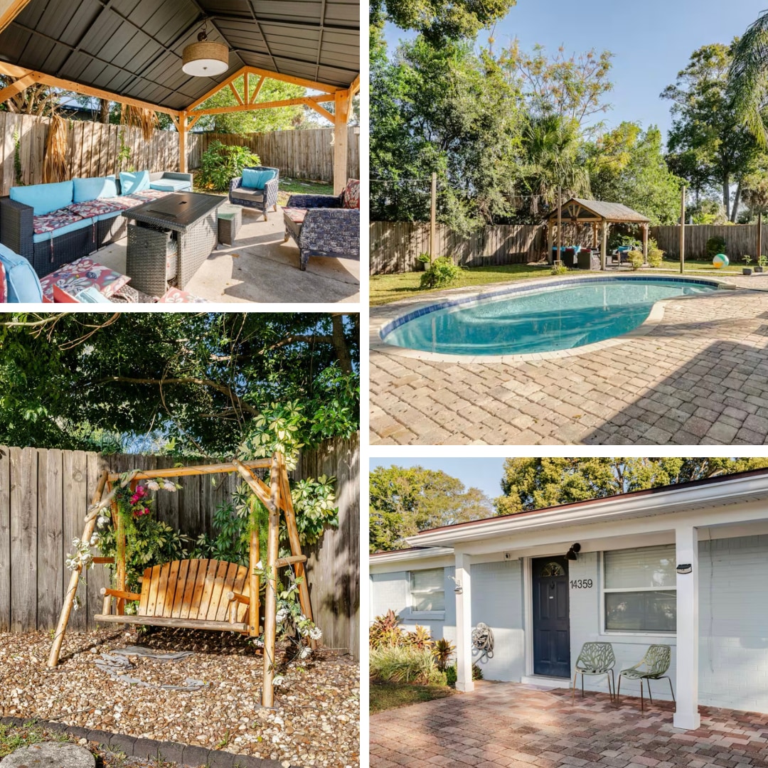 Experience relaxed luxury in this spacious 4BR retreat featuring a private solar-heated pool, elegant British-inspired décor, and soaring 10-ft ceilings. Designed for comfort and style, the home offers both refined touches and the space families need to unwind. Enjoy smart TVs in every room, fast Wi-Fi, a fenced backyard, hammock lounge, and poolside grill. Perfect for elevated escapes or family getaways. Pool is solar-heated; temperature varies with weather and may be cooler in colder months.