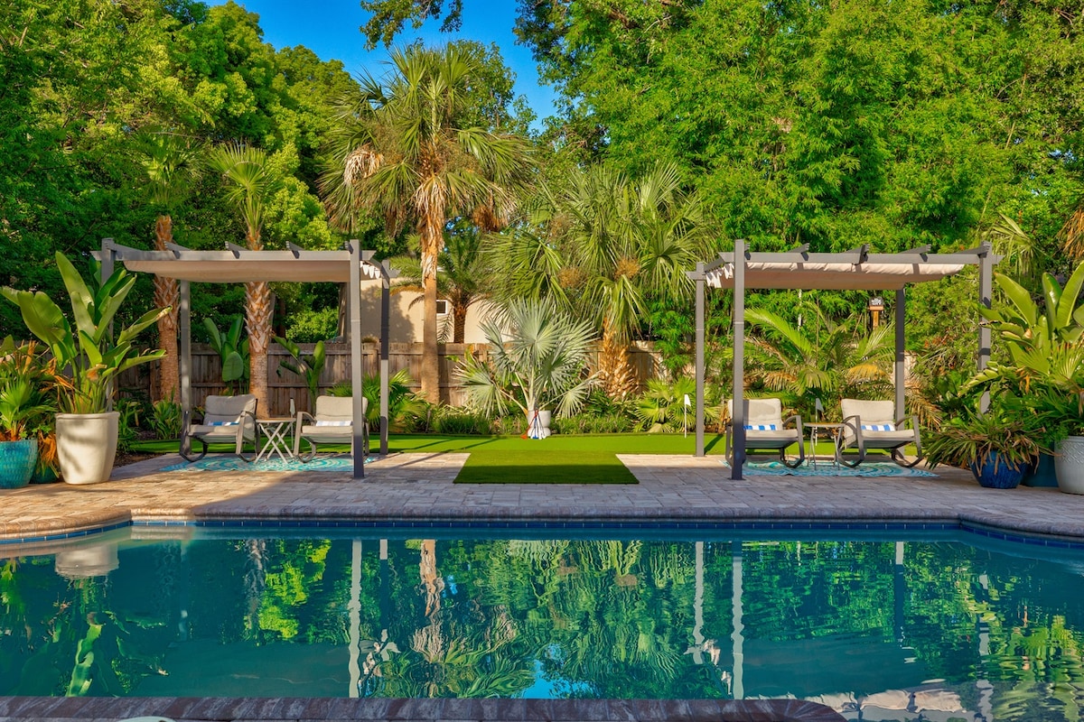 Experience relaxed luxury in this spacious 4BR retreat featuring a private solar-heated pool, elegant British-inspired décor, and soaring 10-ft ceilings. Designed for comfort and style, the home offers both refined touches and the space families need to unwind. Enjoy smart TVs in every room, fast Wi-Fi, a fenced backyard, hammock lounge, and poolside grill. Perfect for elevated escapes or family getaways. Pool is solar-heated; temperature varies with weather and may be cooler in colder months.