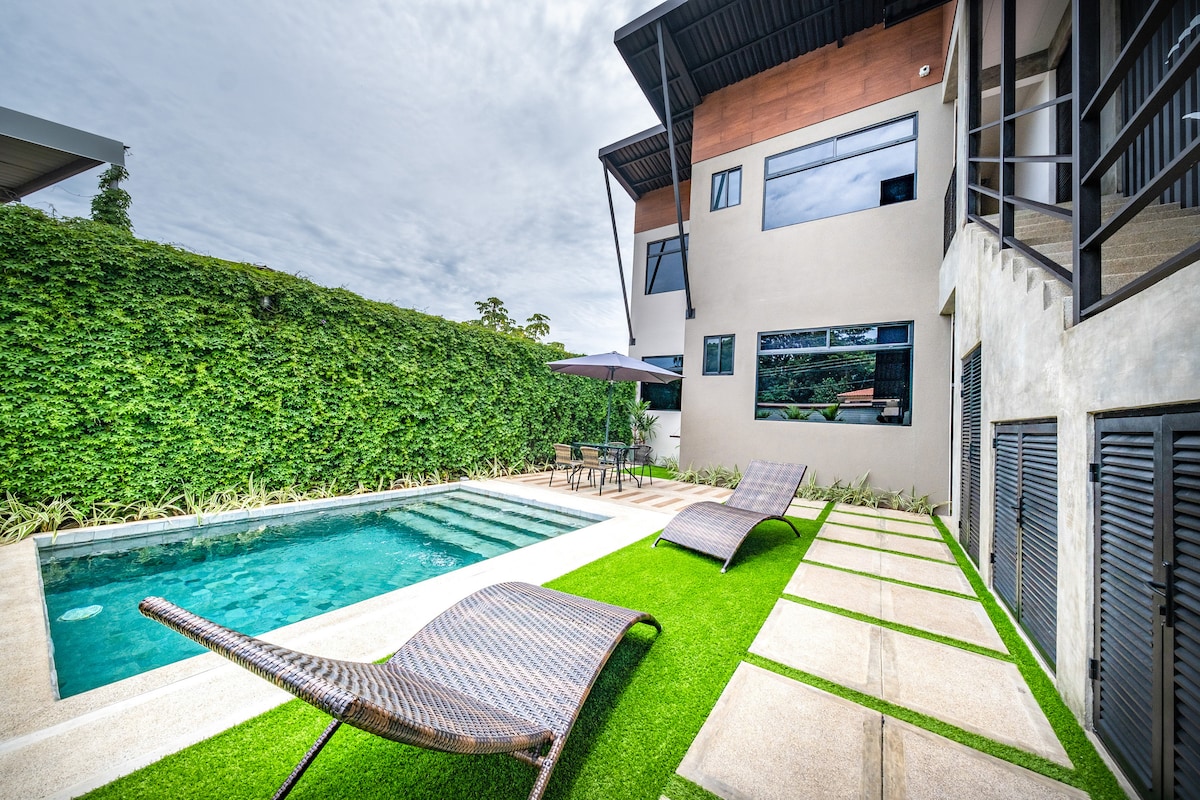 Loft 45 is a peaceful tropical getaway for couples or families, just minutes from stunning beaches. Enjoy your own private pool, surrounded by lush nature where monkeys and scarlet macaws roam freely. Relax in privacy or explore nearby surf spots, national parks, waterfalls, and sunset catamaran tours. Fully equipped for comfort, with fast Wi-Fi, A/C, and a cozy atmosphere. Ideal for reconnecting, creating memories, and enjoying pura vida together in a unique Costa Rican paradise.