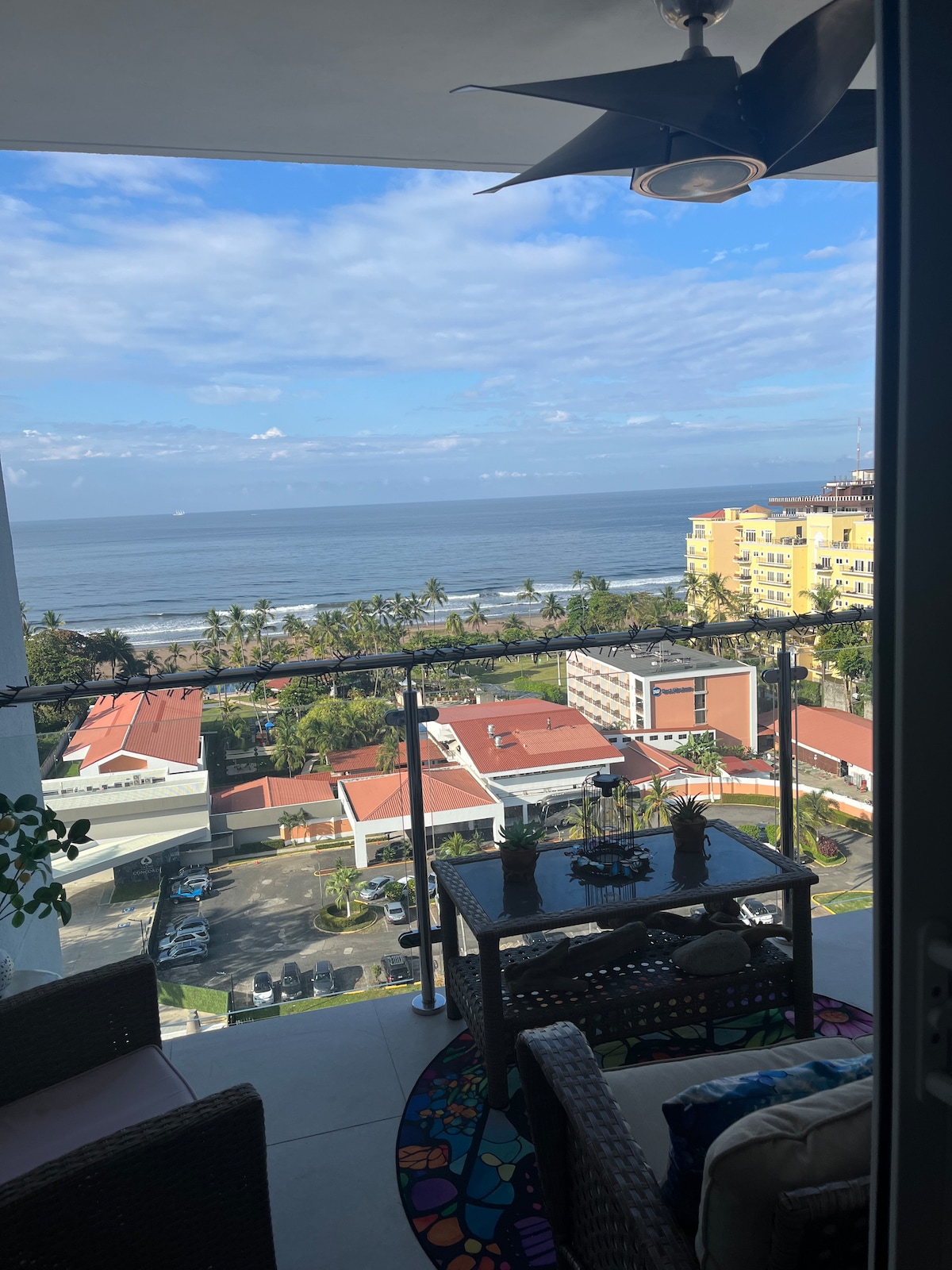 Outstanding ocean view condo on the 11th floor of oceanfront-The Pacific Point. Located in the heart of Jaco, this stylish 1 bedroom with king bed, 1 bathroom residence, features a full kitchen with island, spacious balcony, and spectacular views! 4-star quality accommodations from cleanliness to amenities. The Pacific Point has 2 pools, a rooftop viewing deck, gym, 24-hour security, and a free parking garage. This condo is not a studio, not on the noisy side, and is above the nearby buildings.