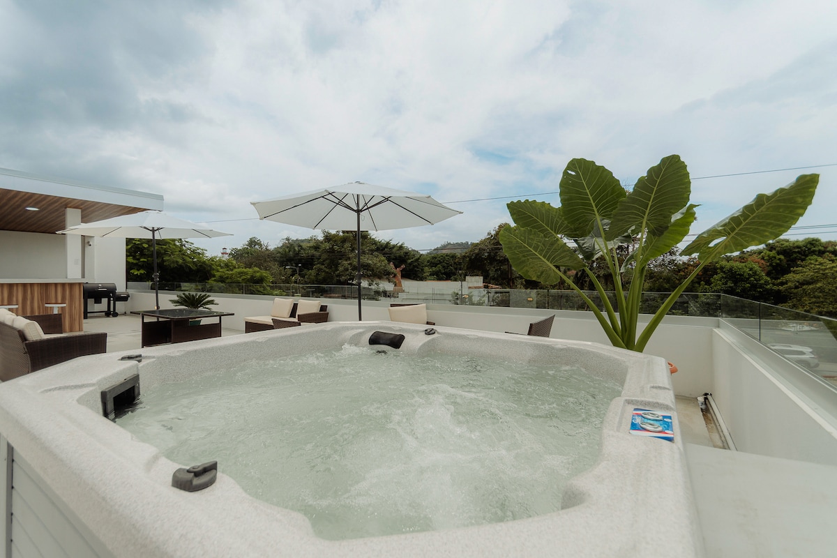 Unique place in Playa Herradura/Jaco. Just 4 minutes from the beach, enjoy stunning sunsets and wildlife like monkeys and macaws. This modern place offers comfort in a lush setting, steps from Starbucks, supermarkets, and restaurants. Just 5 min from Los Sueños Marina, and 10 minutes from Downtown Jacó you'll find yourself in a quieter and more exotic place, but close to all the fun. Relax in the jacuzzi under the stars, enjoy a BBQ with a sunset view and live the Pura Vida beach experience.