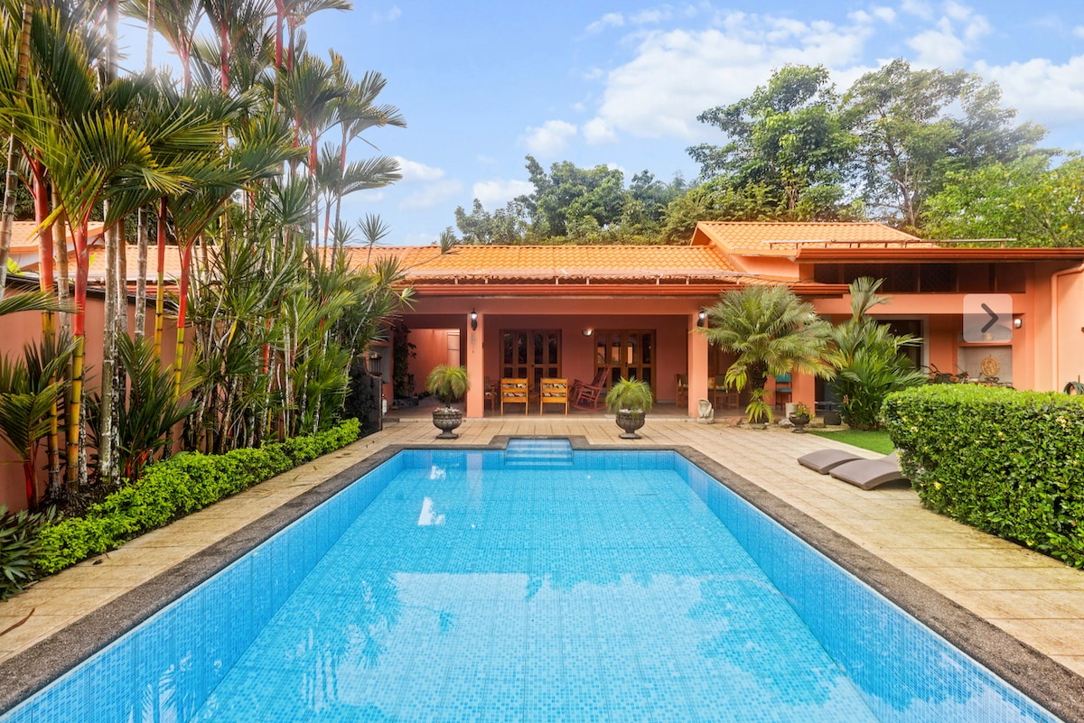 Unique and unforgettable. Private luxury villa with an excellent location in Jaco Beach. 2 adjacent homes connected by breezeway and a sparkling waterfall pool in the center courtyard. Built with rare hardwoods, high ceilings, large windows and terraces, the space is perfect for taking in the natural setting and beautiful gardens. Along with exotic plants and flowers, you may see a variety of wildlife such as hummingbirds, parrots, iguanas, etc, who also enjoy this relaxing riverside paradise.