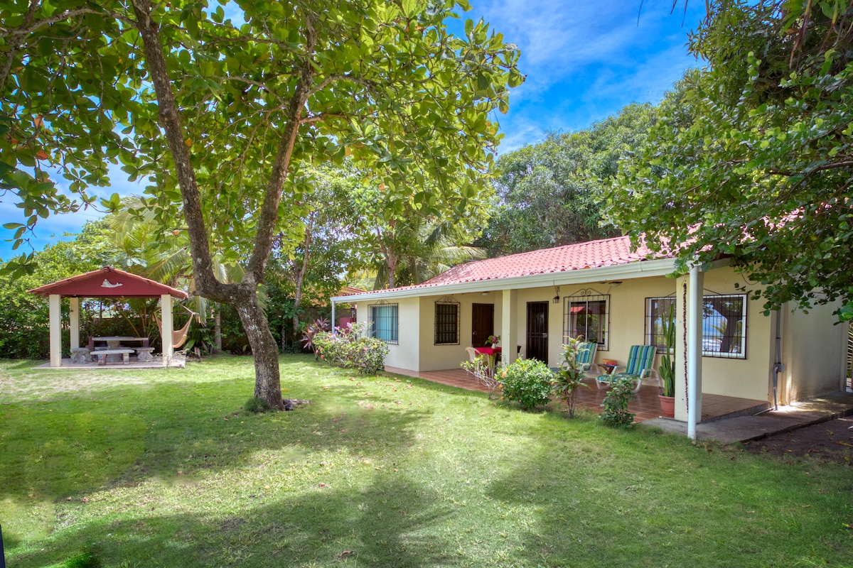Frente al mar. A solo 2 horas del Aeropuerto Juan Santamaría. Disfrute de una espectacular vista y el sonido del mar, mientras esta en la piscina, desayunado o descansando. Excelente para surf. Con marea baja se forman piscinas de arrecifes seguras para los niños, ideales para snorkeling. Las iguanas, guacamayas de colores y cangrejos son parte de entorno. Cerca de sitios de canopy, diving y pesca. Hasta 6 personas incluye 2 habitaciones, de 7 a 8 personas 3 habitaciones