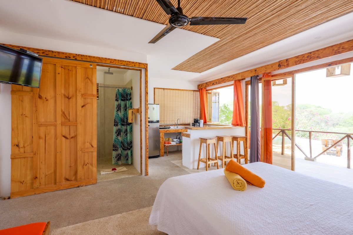 Playa Hermosa Surf. Amazing Sunsets! Enjoy your stay in this luxury ocean view boutique Penthouse featuring 1 ocean view master bedroom with 1 King size bed, walking closet and bathroom. 1 Bedroom with queen size bed and bathroom, large living/dining area with high ceilings (1 extra sofa-bed), fully equipped kitchen, large balcony with expanded Pacific Ocean views, garden and mountain views. Ideal for a group of friends or family up to 5 people & for couples to come and enjoy this paradise.