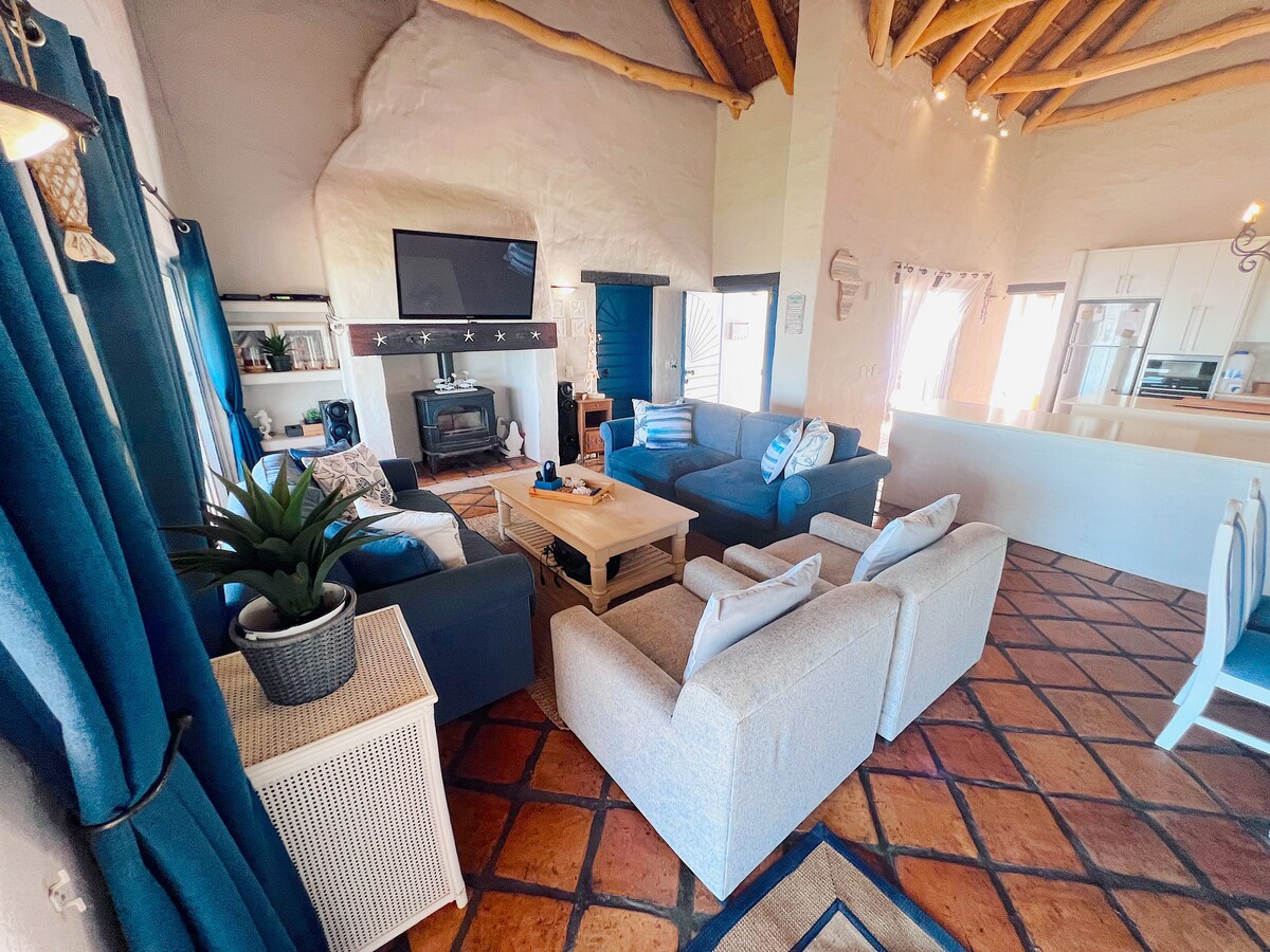 Weskus-Beskus is a recently completed 2 bedroom, dog friendly house on the beach. Purpose designed, in a modern West Coast Style. All rooms have ocean views. En suite bedrooms, quality beds and Egyptian cotton awaits you. Inside and outside braai areas and the third, a starry sky Boma Braai. Large veranda. Comfortable modern uncluttered interior. Stunning sunsets. Miles of safe, sandy beach. Bring your dog! 165 km from Cape Town, 13 km from Velddrif. All welcome.