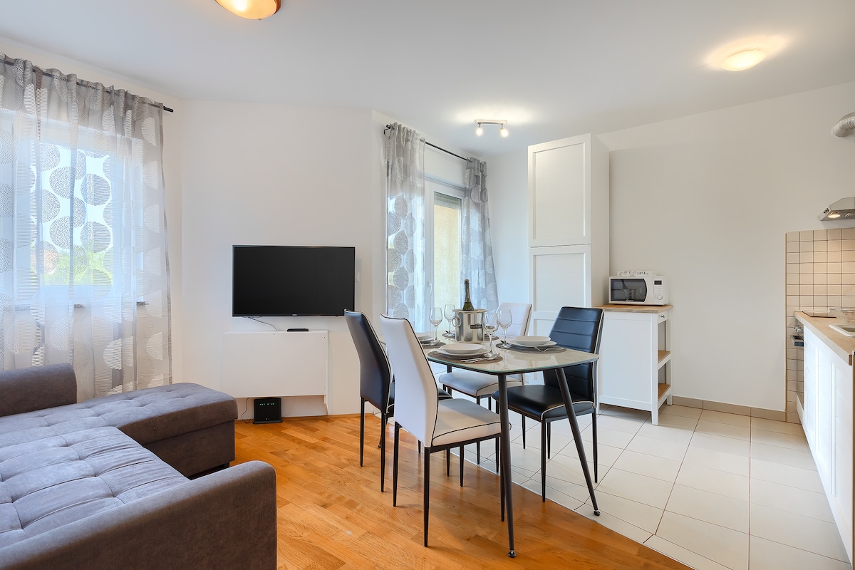 A small ground-floor apartment in a quiet residential area, with a fully fenced garden, covered patio for outdoor sitting and a designated parking spot in front of the building. Ideal for 2-4 people. The apartment is within walking distance of a grocery store and a restaurant (5 minutes). Other town amenities are available in Pula (8km) or Medulin (5km), so getting around by car is recommended. The closest beach is 4km away.
