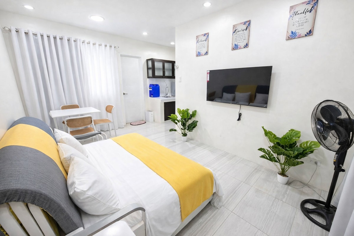 Simple, clean, self contained studio apartment with kitchenette and access to separate kitchen room for cooking (so no cooking smell in studio), garage parking, aircon, TV with USB movies, free fast Wifi, minutes walk or trike to SM City, MV Gallego City hospital, City Hall, Hall of Justice and night life/ restaurants. We are just off the national highway. Studio is in the second floor with owner on-site. Ideal for solo travellers, couples, workers and visitors. 24hour Trike access downstairs