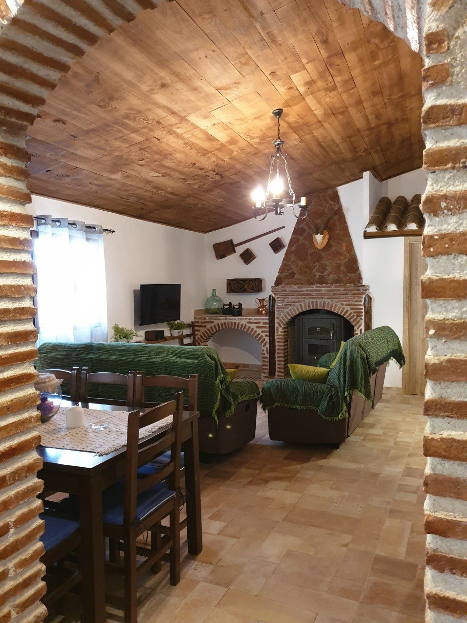 El alojamiento cuenta con un amplio salón con chimenea de leña, un cómodo sofá para relajarse después de las excursiones y paseos, una mesa con capacidad para cuatro comensales. La cocina está equipada con el menaje necesario. En cuanto a los dos amplios dormitorios, uno con cama de matrimonio y otro con dos camas individuales, están pensados para el descanso y confort de los clientes con colchones viscoelásticos, armarios con cajoneras y mesitas de noche.