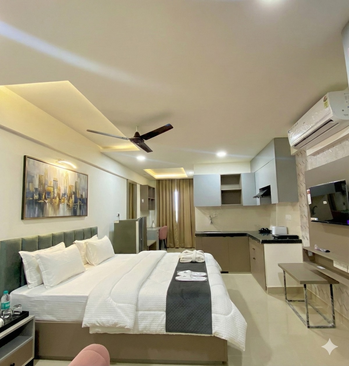 Welcome to The Starlit Stays – a cozy, modern studio apartment perfect for solo travelers and couples. Located just a short walk from shopping complexes, general stores, and medical facilities, it’s your ideal city escape. Enjoy smart amenities like a Smart TV, WiFi, AC, Chimney, Fridge, RO Water Purifier, Geyser, and Lift access. With 24/7 CCTV security, your stay is both safe and comfortable. A peaceful, stylish hideaway designed for comfort and connection.