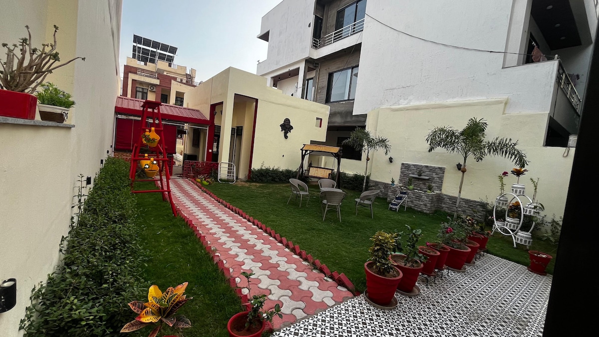 Kaushik House Homestay just an 8-minute drive from Vaishali Nagar. • Two Cozy Bedrooms: Each room is furnished with a plush double bed. • Inviting Living Room: Relax on comfortable couches after a day of exploring Jaipur. • Dining Hall: Enjoy meals in a cozy setting with floor dining and a snug couch. • Fully-Equipped Kitchen: Prepare home-cooked meals with all the essential amenities. • Serene Garden: Unwind in the garden perfect for a quiet evening under the stars. • Private Parking