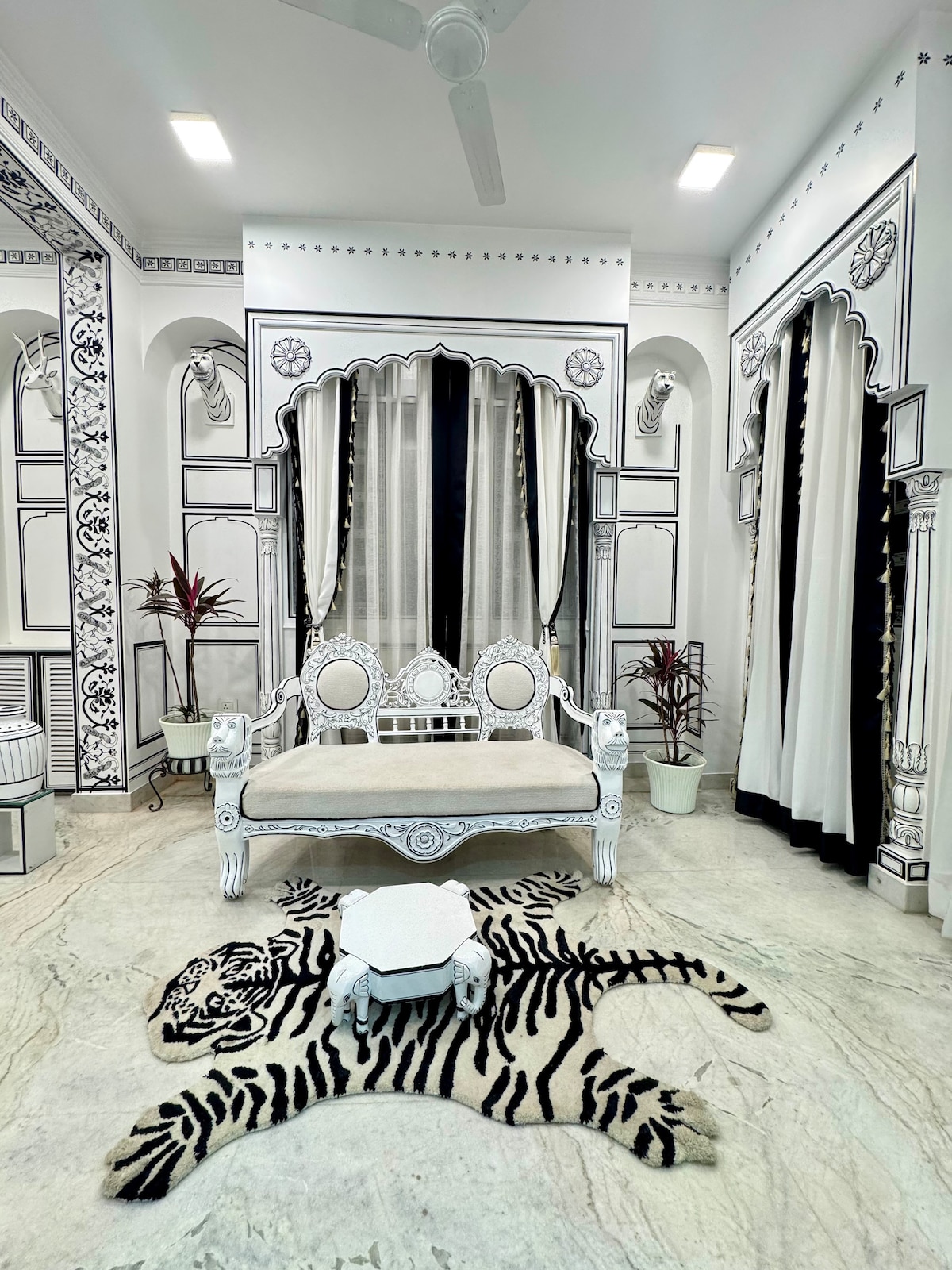 Welcome to The Shri Lalluji Suite — a surreal, hand-painted 1-bedroom stay where you don’t just live in a home, you live inside a sketch. Every wall, arch and frame is designed using traditional Rajasthani miniature fresco work in black-and-white. A perfect escape for couples, design-lovers and slow travellers, this suite blends Jaipur’s royal heritage with intelligent modern comfort.