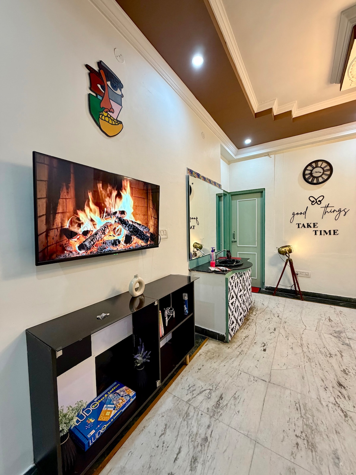 Nestled in the heart of the city, this beautiful boutique studio offers a harmonious blend of modern comfort and convenient access to all the attractions. There's a lush queen-sized bed with premium linens, promising a restful night's sleep after your urban adventures. It comes with a well equipped kitchen, a smart TV, sofa cum bed and a pool with a view of the Nahargarh Fort. This studio is centrally located with public transports nearby to help you explore the city.