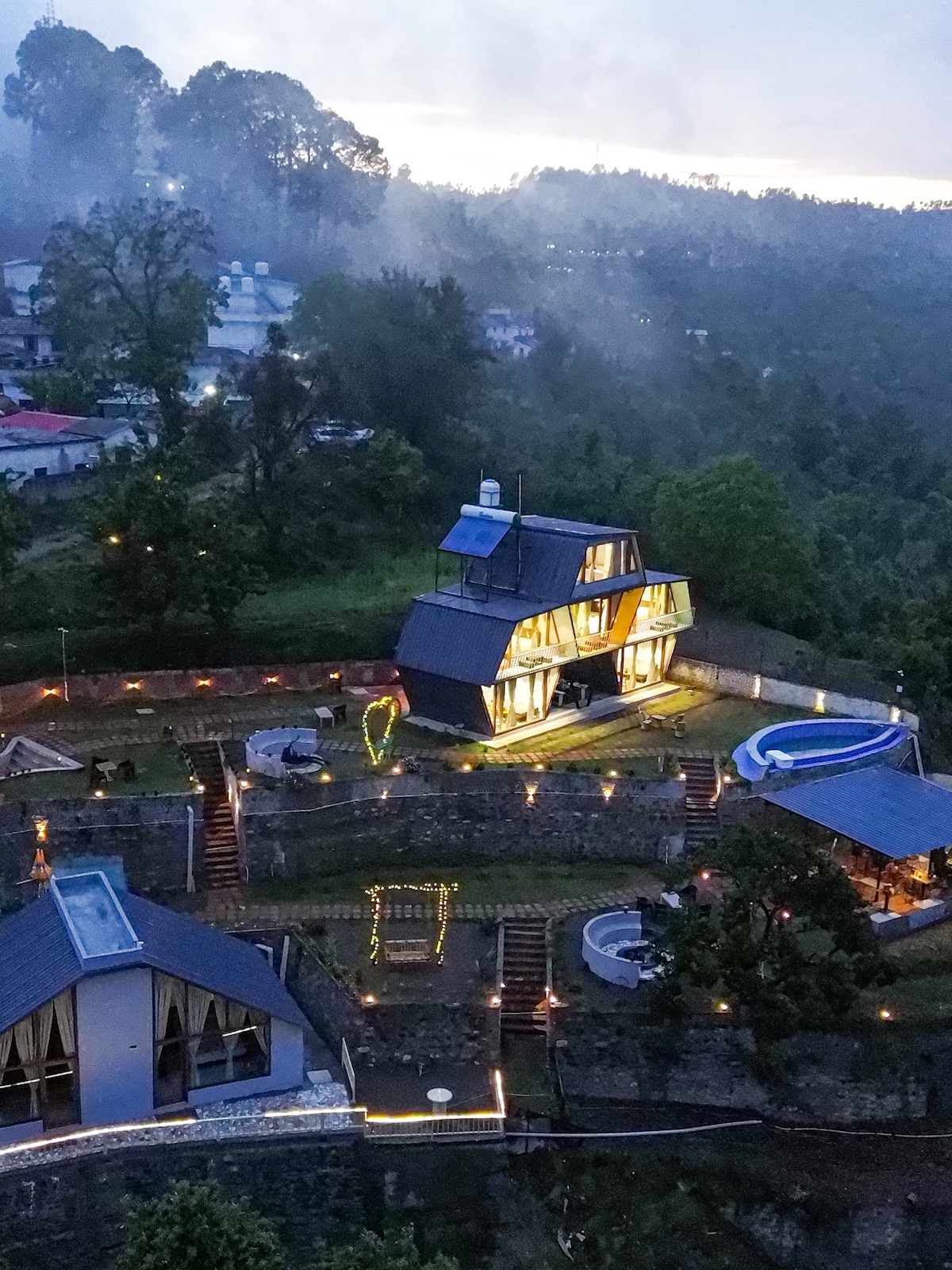 Camouflaged amidst a virgin pine and oak forest at 7000 feet, on the slopes of a remote, yet reachable, hamlet called Chalnichina (50 kms from Mukteshwar), is a soulful 02 Bedroom Private Retreat aptly called "The House on the Slope". The House sits upon multiple terraced fields giving way to a unique layered architecture. An all-glass skylight runs through the roof and transitions into the front wall of the house offering breath-taking views of snow-capped Himalayan peaks such as Trishul .