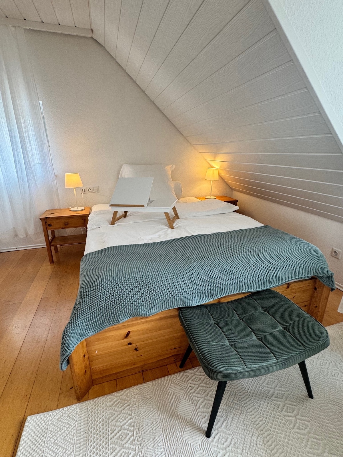 Unser kleines Ferienhaus in Detwang bietet auf 70 m2 Wohnfläche Platz für bis zu vier Personen. Der ruhige Ort liegt direkt an der Tauber und nur wenige Minuten von der mittelalterlichen Altstadt Rothenburg ob der Tauber entfernt. Ideal für Naturliebhaber, Radfahrer und alle, die die Region erkunden möchten. -EG: Gut ausgestattete Küche, Wohn- und Esszimmer, Badezimmer mit ebenerdiger Dusche und WC -OG: Zwei Schlafzimmer, Gäste-WC, Schreibtisch -Kleiner Garten mit Sitzgelegenheit, Fahrradkeller