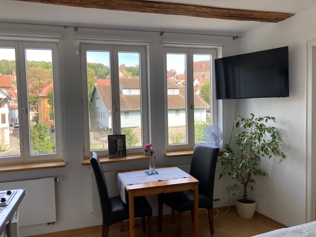 Welcome to our vacation apartment! 🏡 On 38sqm you will find enough space for a cozy living/sleeping/dining area 🛋️, a fully equipped kitchen 🍴, a bathroom 🚿 with shower and washer-dryer and a terrace 🌿. Enjoy the balcony with a view of the pond 🐟 and relax. Free parking 🚗 is available. Only 9 min. by car to the center of Schwäbisch Hall 🏙️. A restaurant 🍽️ in the building offers regional dishes at the weekend. An oasis for relaxed living 🌟.