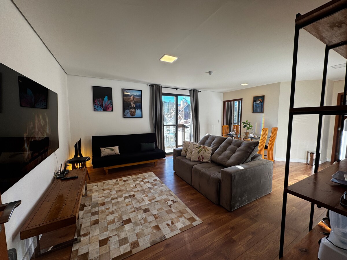 Apartamento completo, fornecemos roupa de cama, edredons, mantas, e toalhas de banho e rosto. Cozinha completamente equipada com panelas de fondue, taças de vinho e de cerveja, forno elétrico e microondas. Sala de estar e jantar aconchegantes com mesa para 8 pessoas, televisão, caixa de som bluetooth e lareira. Suíte com cama Queen muito confortável, muito bem decorada e roupa de cama de qualidade. Apartamento à aproximadamente 15 minutos andando do Capivari. Condomínio seguro e bem localizado