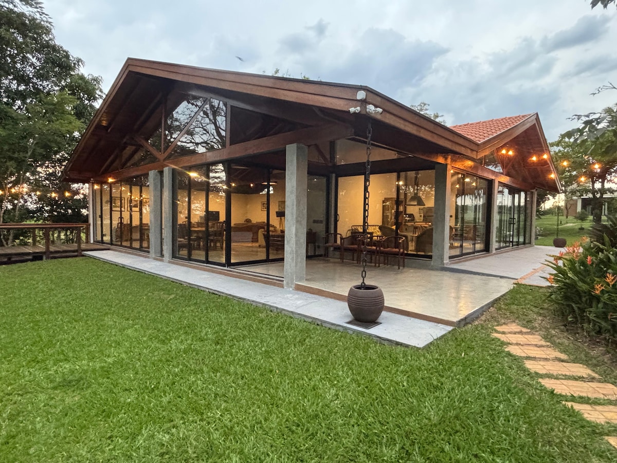 Comfortable and spacious farm facing a dam, perfect for relaxing with a barbecue by the pool, practicing water sports, or working in isolation and close to nature with fiber optic internet. It has a swimming pool with a large barbecue place nearby, a mini playground for children, a soccer field, volleyball and “beach tennis” on the grass, an orchard, and two rooms with a large table for meals (one indoor and one on a covered terrace ).