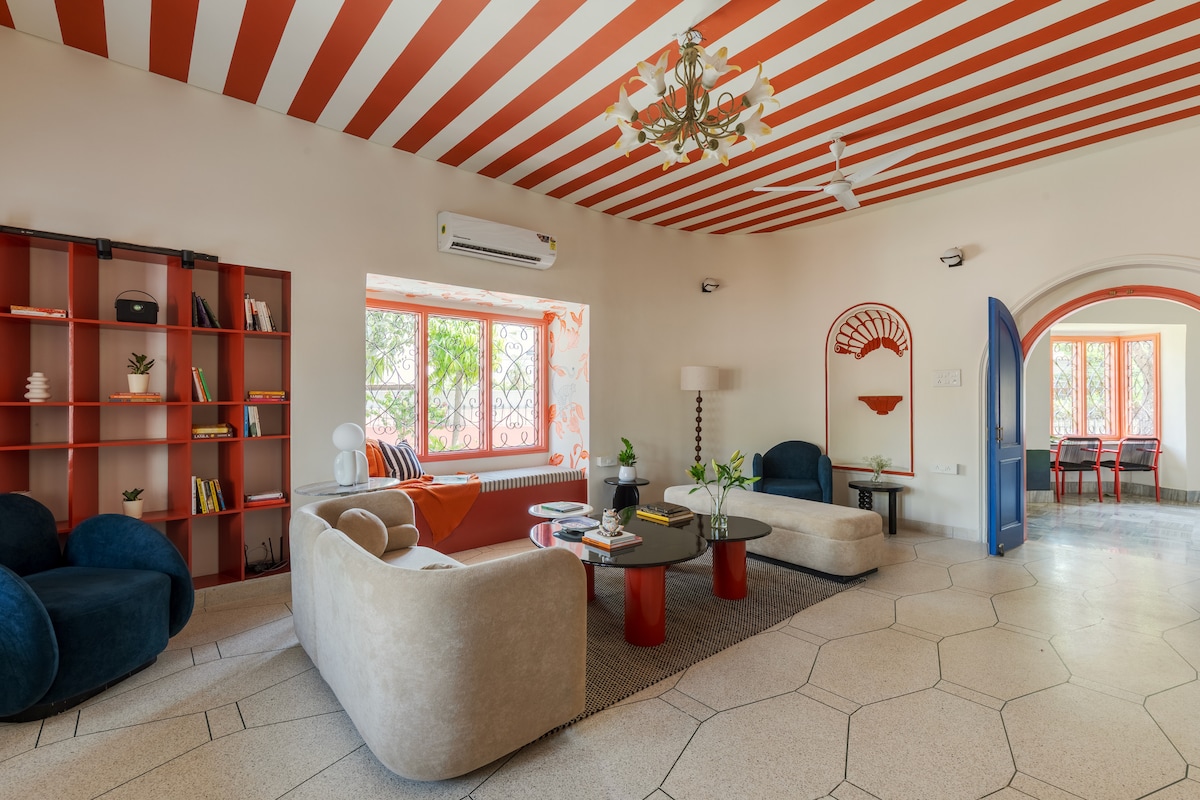 Dolce Den – A Luxe Artistic Stay in Jaipur Expansive Patio: Perfect for morning coffee or starlit soirées. Entertainment Suite: State-of-the-art projector and sleek pool table for ultimate fun. Opulent Bedrooms: •Lunar Retreat: Drift under moonlit art and serene murals. •Flamingo Suite: A vibrant flamingo-inspired luxury Gourmet Open Kitchen & Bar: A chic space for culinary creations and stylish sipping Dolce Den blends serenity and opulence for an unforgettable experience.
