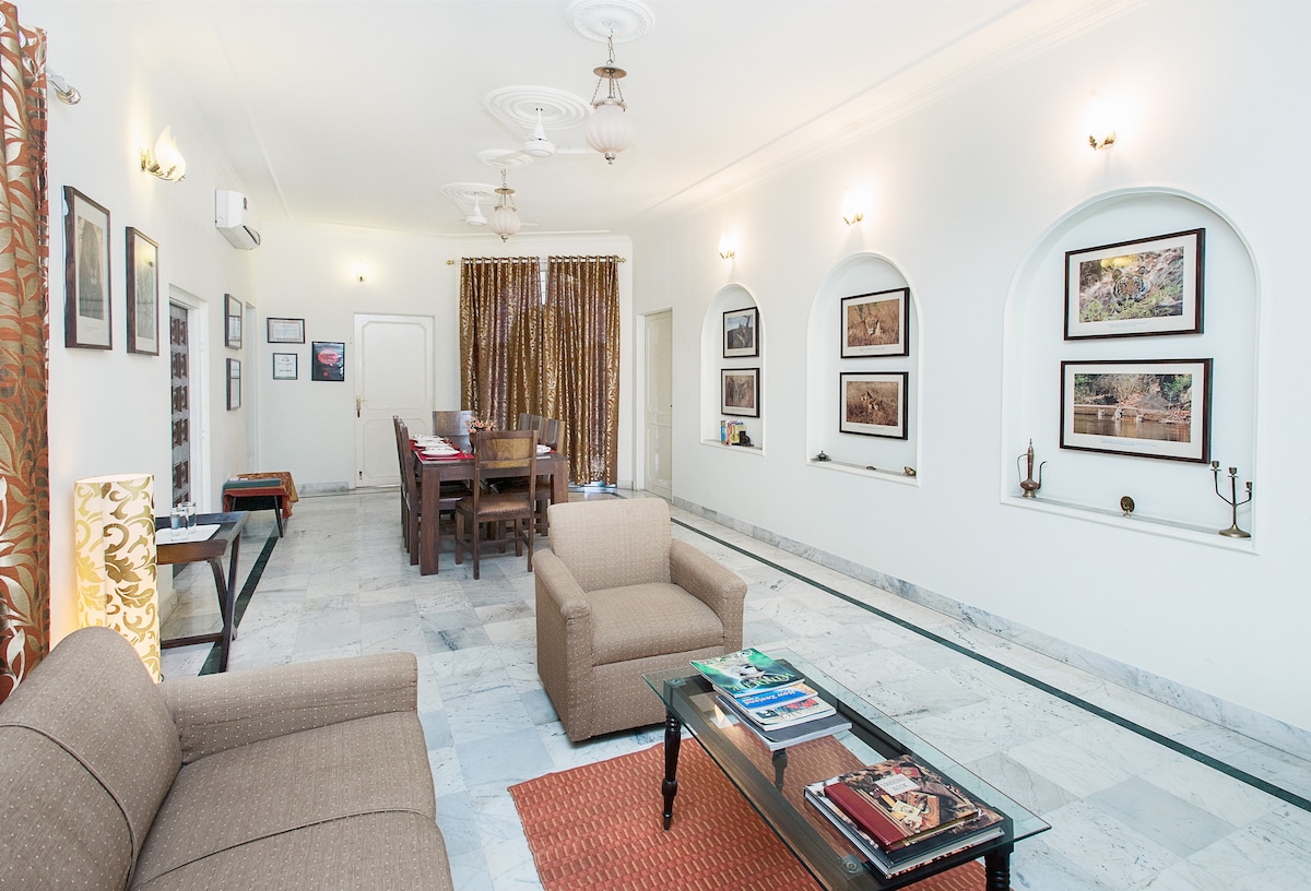 This accommodation, Palm 34, is located in Civil Lines, the most premium location in Jaipur. It is a lavish modern bungalow wrapped around with a lush green lawn. The listing has 4 spacious rooms on the second floor to accommodate 14 guests with extra beds. Additionally, it has a luxurious living area, an aesthetic dining area, and a private kitchen. The guests are free to relax and rejuvenate on the beautifully designed terrace. A private cook can be arranged for an additional charge
