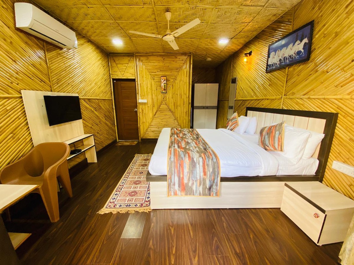 The room is spacious and airy, with plenty of natural light streaming in through the windows. The marble flooring adds an elegant touch to the space. Step onto the balcony, an extension of the room's tranquility. The ensuite bathroom features modern fixtures and a spacious shower. Room features air conditioner, TV, work table and chairs. Room size is 219 sq ft. Breakfast is avilable @ 400/person+tax. Lunch and dinner is also served (variable price). Meals on prior request.