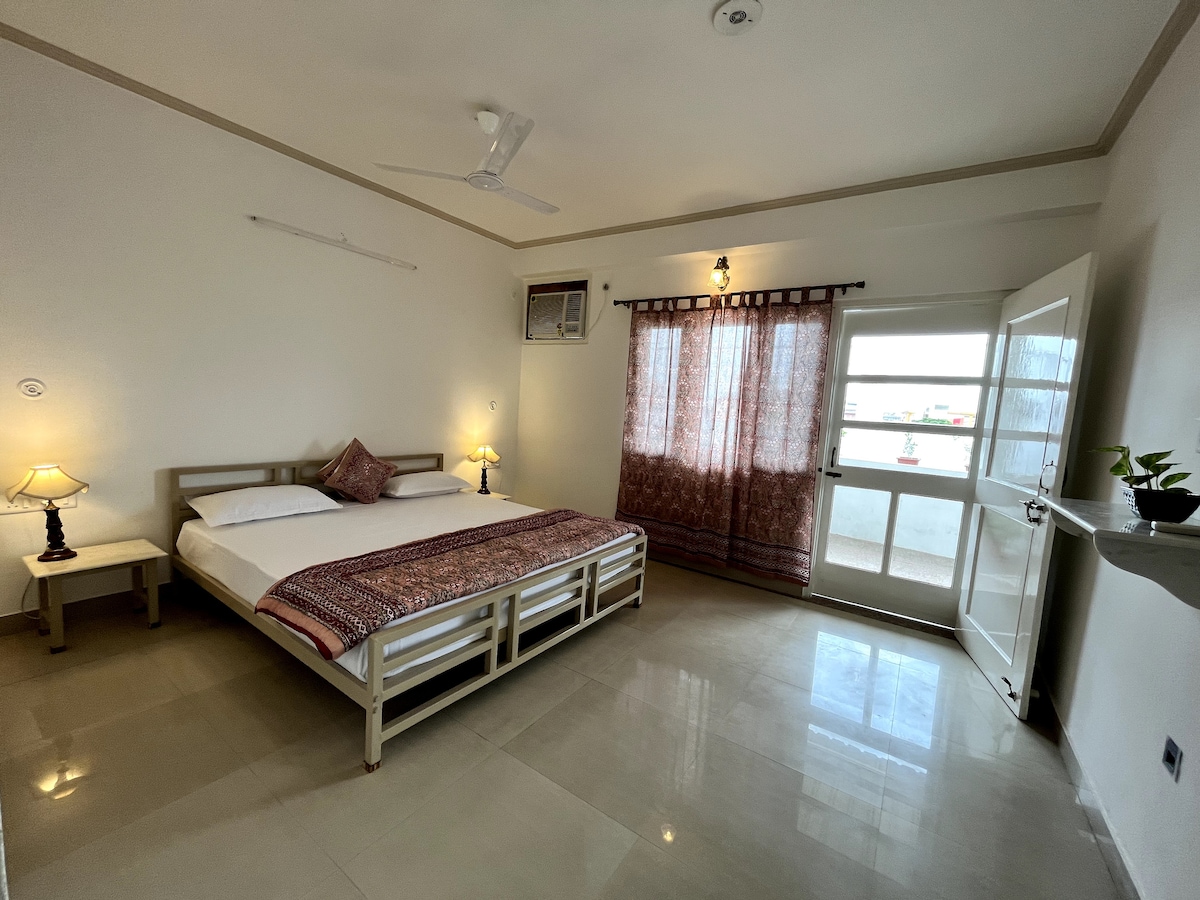 "The Golden Door" is an artistically designed room with an attached bathroom on a private terrace with panoramic views of the Aravali Hills. Ideal for couples, solo travelers, and business professionals, this accommodation seamlessly blends aesthetics and functionality. Its central location grants easy access to major attractions. In essence, "The Golden Door" transcends conventional stays. With its central location, artistic design, and comfort, it provides a simple yet unique stay.