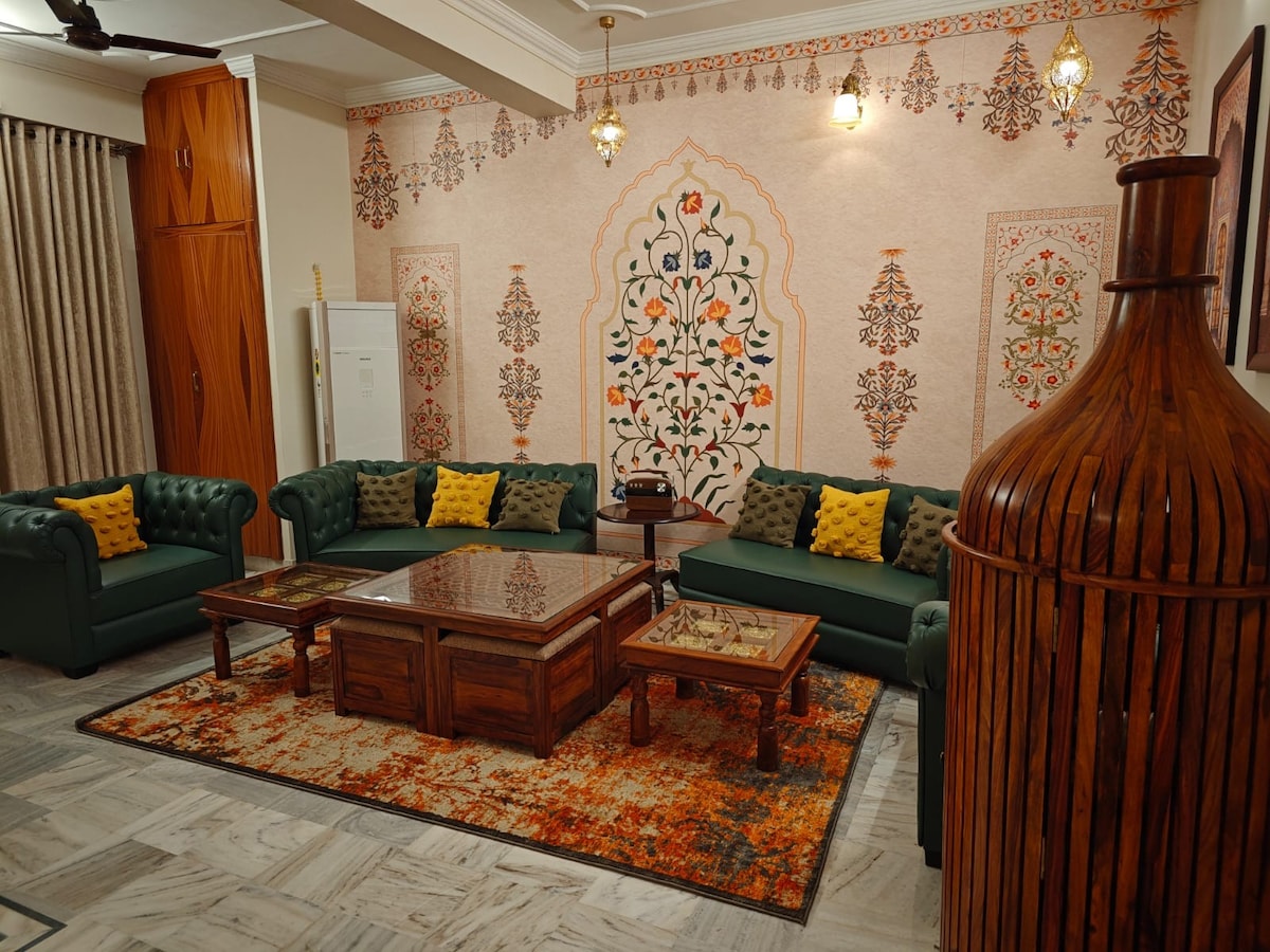 *GRAB THE OPPORTUNITY* to Stay'N'joy the royalty of Pinkcity in this Beautiful/Luxury Apartment situated at 1st Floor, decorated with blend of modern/traditional interior. AC living room/2 AC Bedrooms(King-size Bed)/2 Baths/fully Equipped Kitchen. Huge Patio.Corner property, excellent ventilation,All Basic Amenities .Extra mattress/Washing Machine(Chargeable). Ample parking/RO/CCTV. *REGISTERED HOME STAY WITH TOURISM DEPARTMENT, GOVT. OF RAJASTHAN* **AFFORDABLE YET LUXURY**