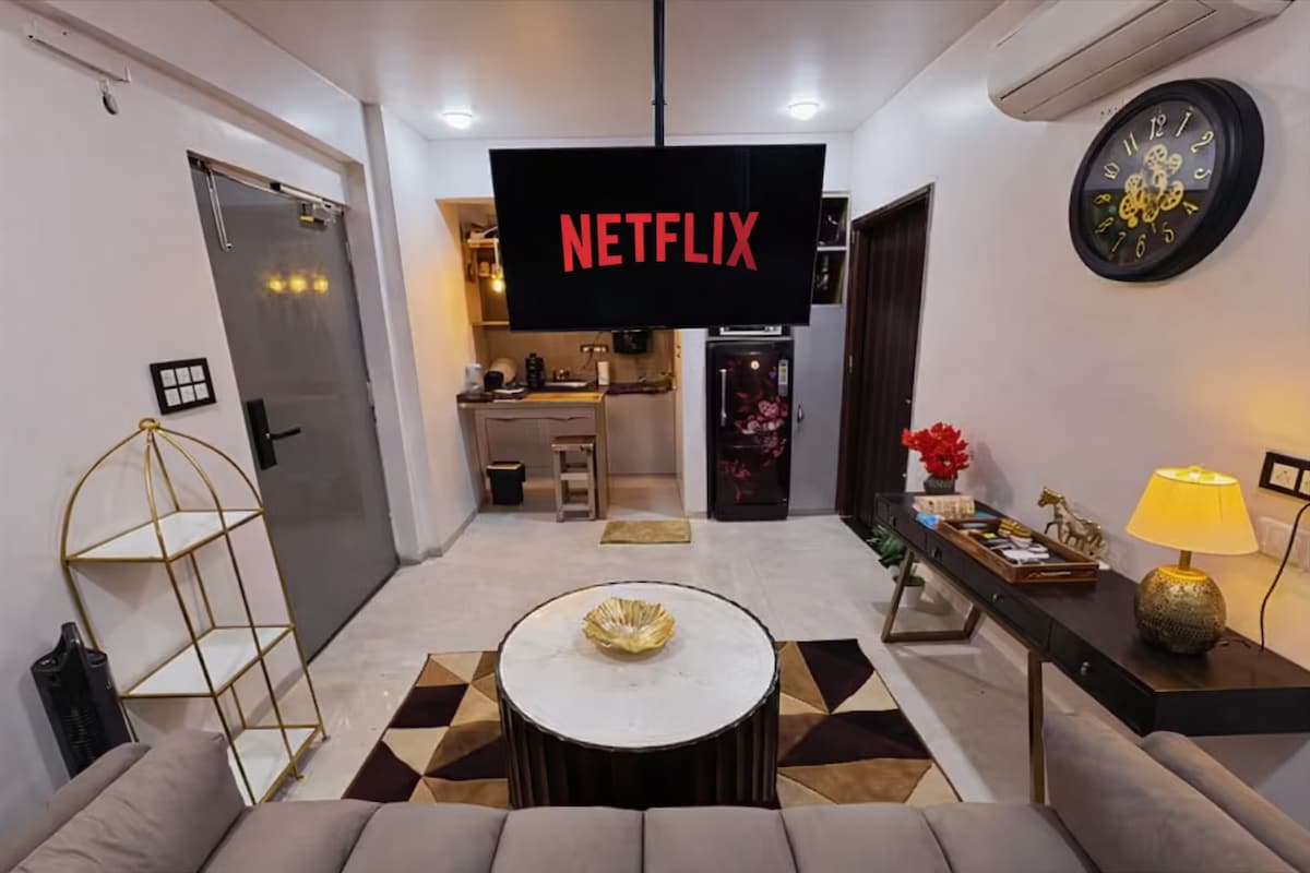 Centrally Located Apartment with railway station just 4 mins away? - you get it Fast Wifi along with 42inch TV and OTTs for entertainment? -you get it Microwave, Refrigerator, RO, Induction for fooding needs? - you get it Access to gym & infinity pool? - you get it Amazing Interiors with comfortable bed? - you get it! This aesthetically designed apartment leaves nothing behind when it comes to comfort, luxury and amenities. Need we say more?