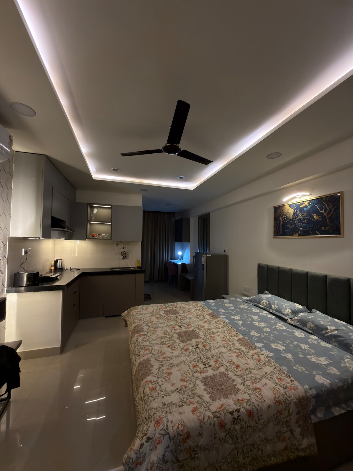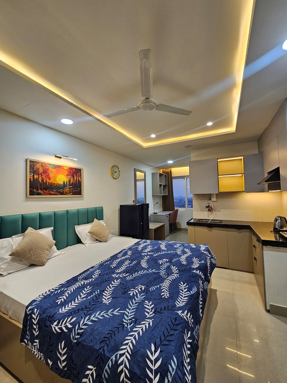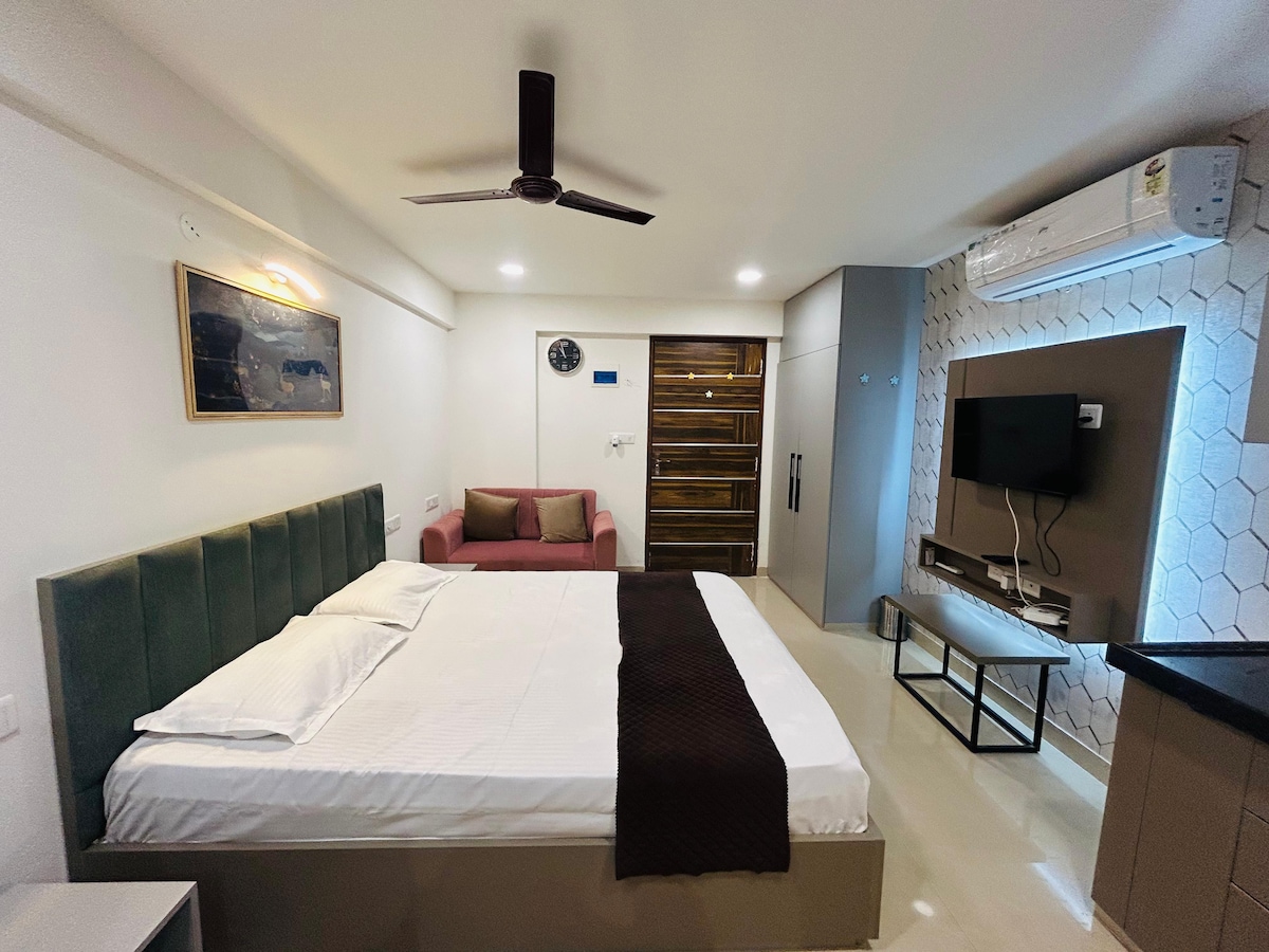 Welcome to this most luxurious and spacious studio apartment (completely separated) with balcony, comfortable king sized bed, beautiful bathroom and fully equipped kitchen, free wifi, free parking Swimming pool (open from April to September or October depending on weather) gym, rooftop garden. located in central of Jaipur, railway station is just - 4 mins away, bus stand - 4-5 mins away AirPort - 9 km Hawa mahal - 4 km City palace - 4.1