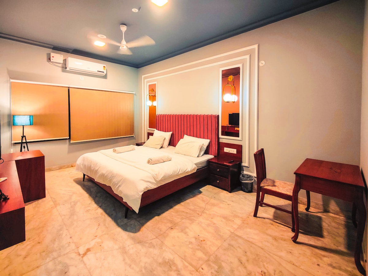 Indulge in the ultimate comfort of our spacious Luxury Double Room, designed for couples, families, and friends. The room features two air conditioners, ensuring a cool and comfortable stay, along with a large, luxurious bathroom that offers ample space and modern fittings. Guests can also relax in the serene outdoor garden, perfect for unwinding amidst nature. With cozy interiors, a plush double bed, and all essential amenities including Wi-Fi, your stay will be both restful and convenient.