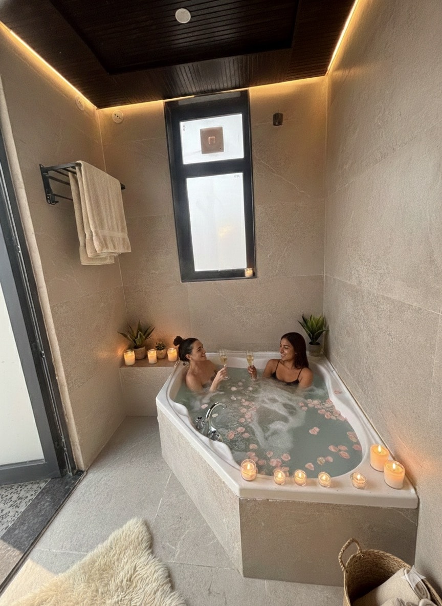 Enjoy a soothing flower-filled bathtub, dreamy forest-themed interiors, and softly lit corners perfect for unwinding. Step onto the rooftop to find comfortable lounge seating, a firepit, twinkling string lights, and even an outdoor movie setup for magical nights under the sky. Every corner is styled with natural textures, soft fabrics, calming lights and the perfect blend of comfort, warmth, and luxury. A peaceful retreat where you can relax, reconnect, and simply enjoy the moment.
