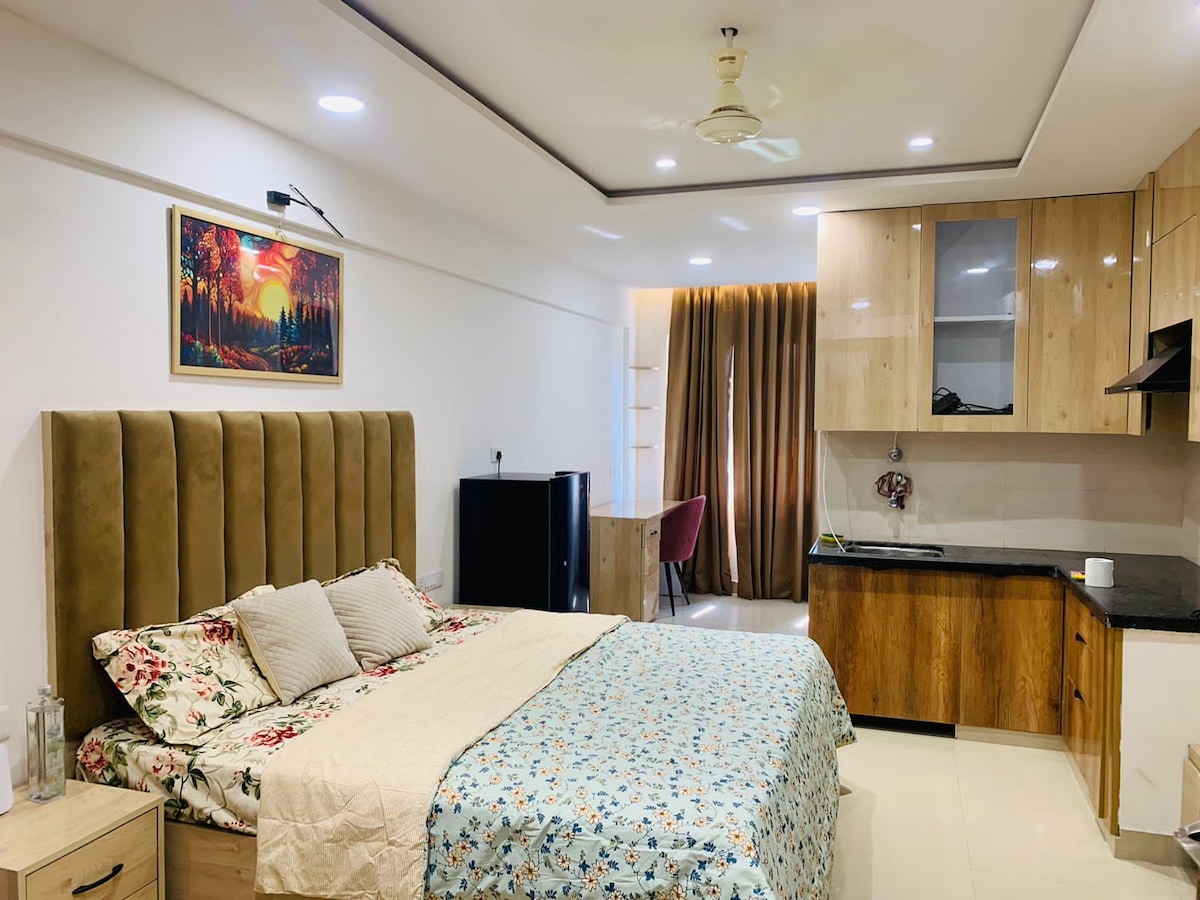 "Welcome to our cozy and charming studio, perfect for solo travelers or couples seeking a comfortable and central base in Jaipur! Nestled in a vibrant neighborhood, our studio features a stylish interior with a double bed, a kitchenette for simple meals, and a private bathroom. Enjoy free Wi-Fi, a smart TV, and a balcony with lovely views. Whether you're exploring ancient temples or indulging in street food, our studio provides the ideal blend of comfort and convenience.