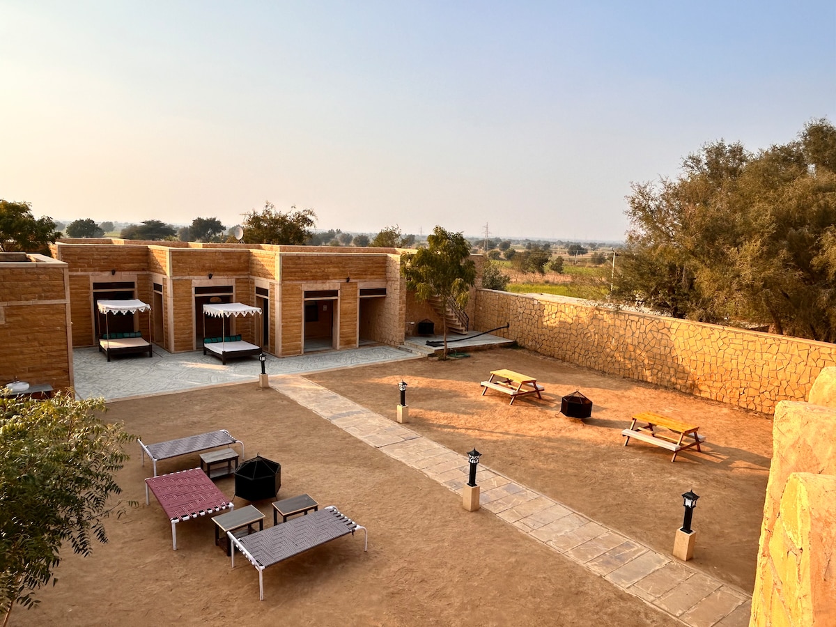 A serene farm stay set amidst 300+ acres of open farmland, far from the noise and rush of the city. Wake up to endless skies, quiet mornings, and nature all around. Perfect for unwinding, reconnecting with yourself, and enjoying slow, soulful days—yet just a short drive from the timeless charm and attractions of Jaisalmer.